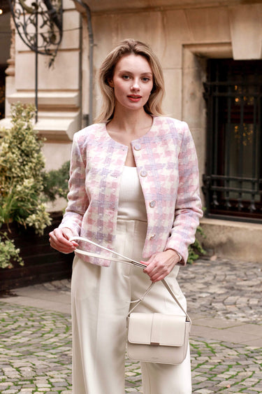 This lightweight short coat jacket is tailored from the finest upcycled wool and fully lined. Designed with a boxy cut, it features long sleeves, a button-down front, and a rounded collar.