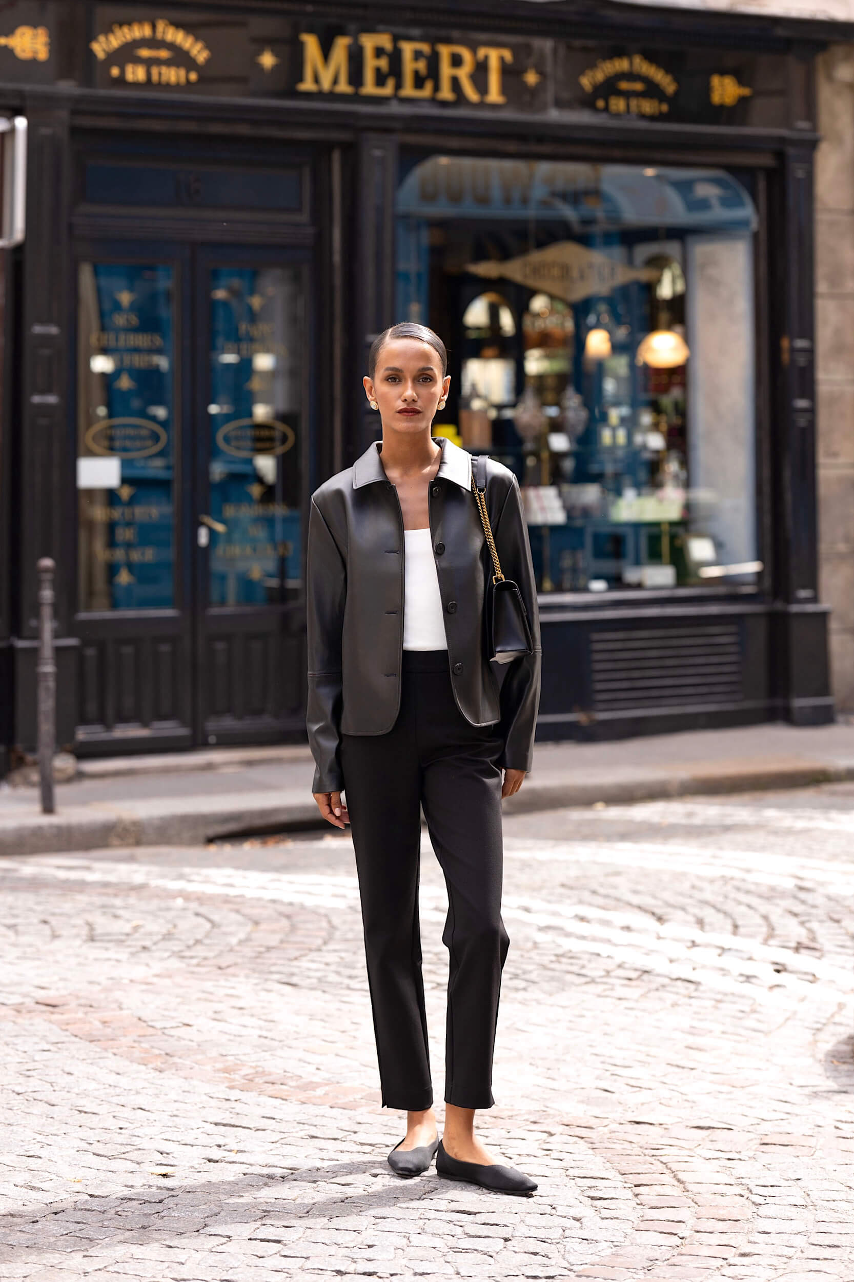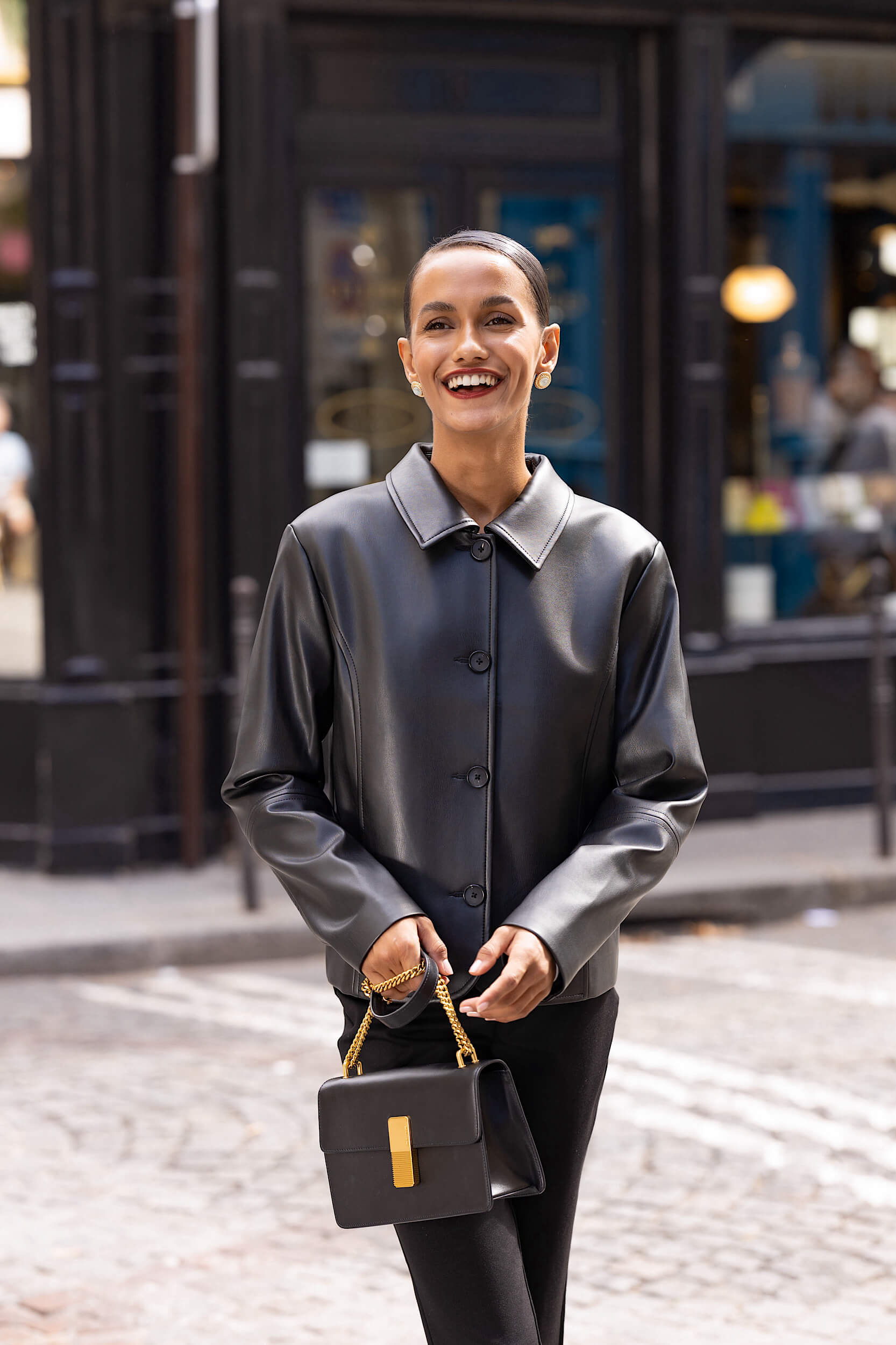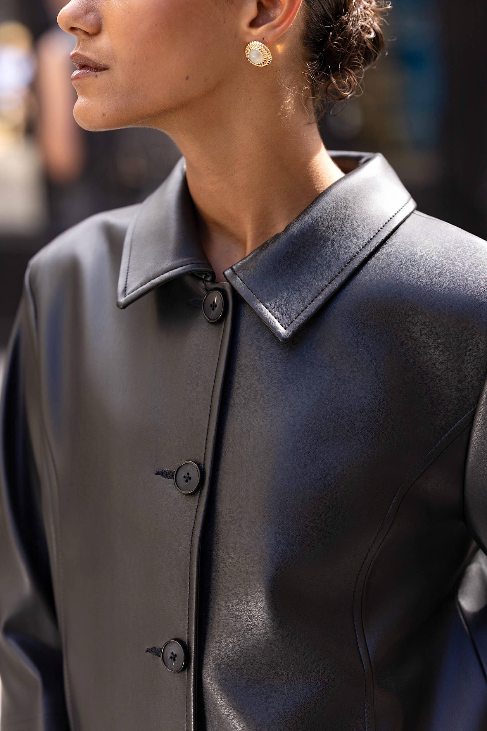 This fully lined short coat is crafted from upcycled faux leather with a soft, smooth finish. It features a straight silhouette with a button-down front, a shirt collar, and rounded edges. Front reliefs are finished with integrated pockets, while decorative horizontal sleeve cuts complete the design.