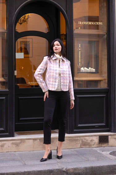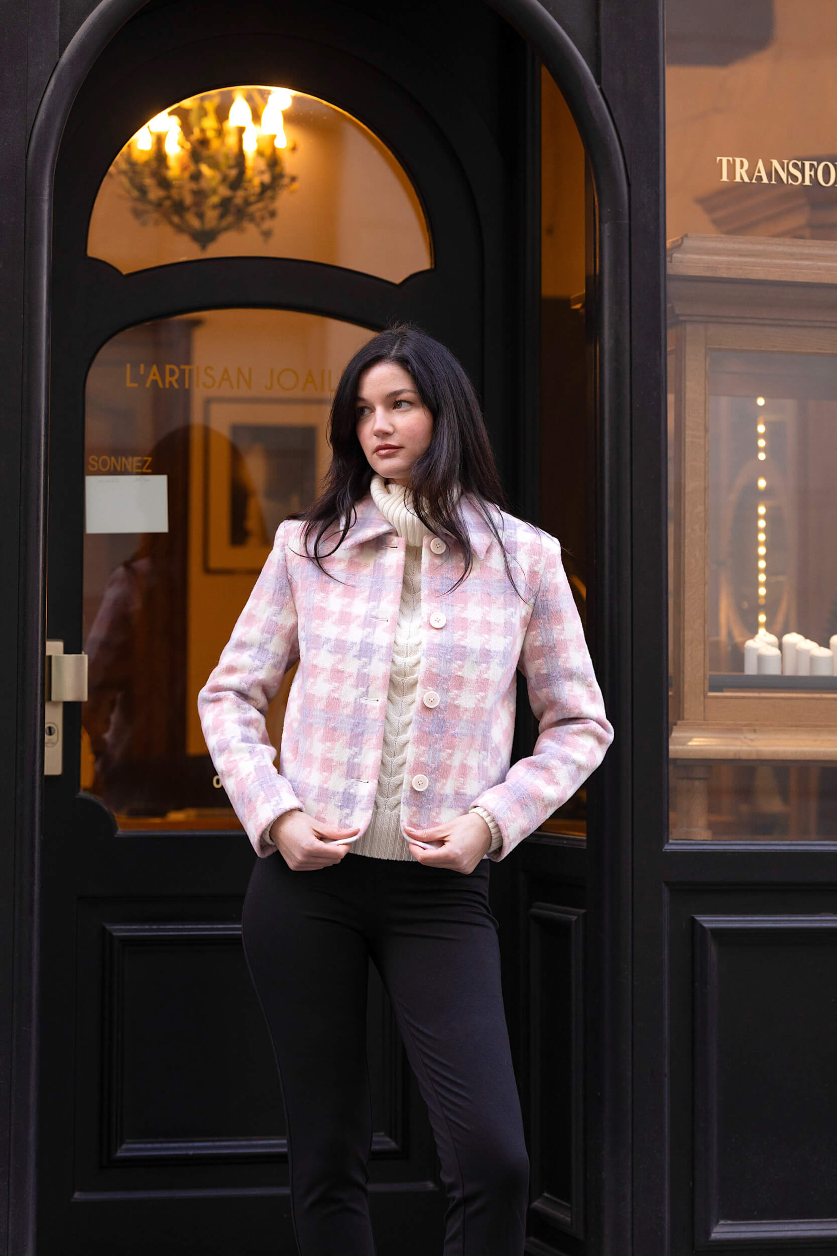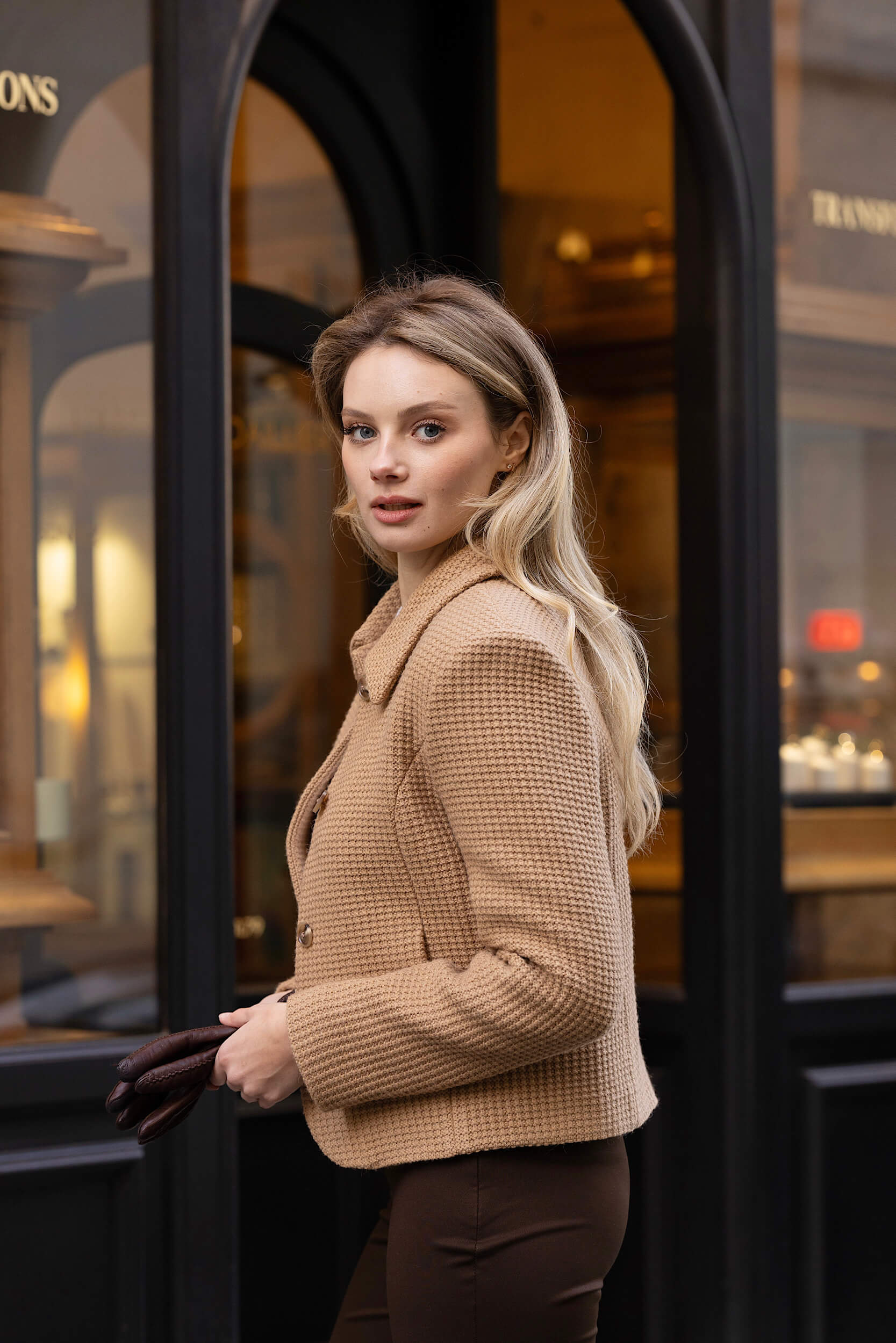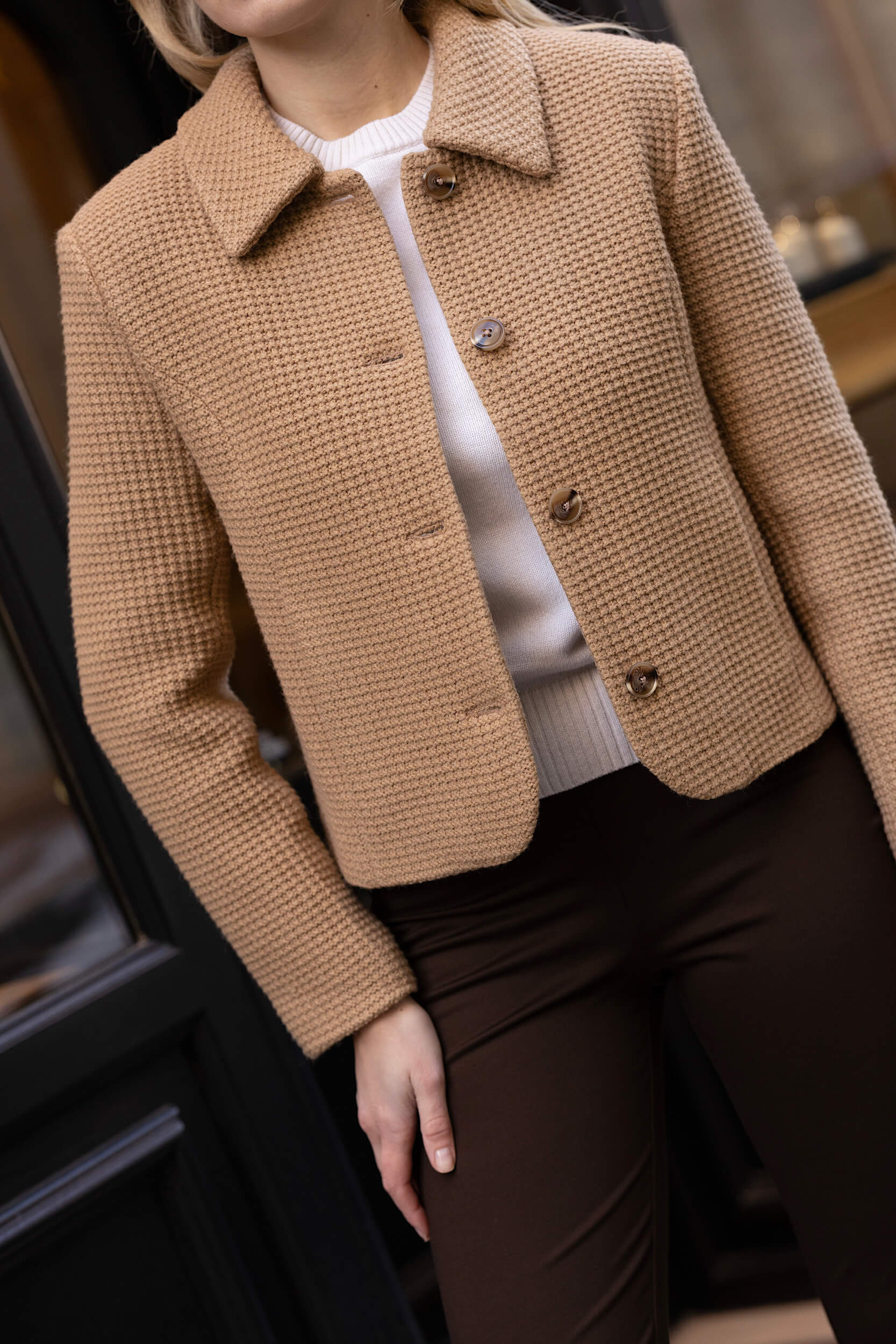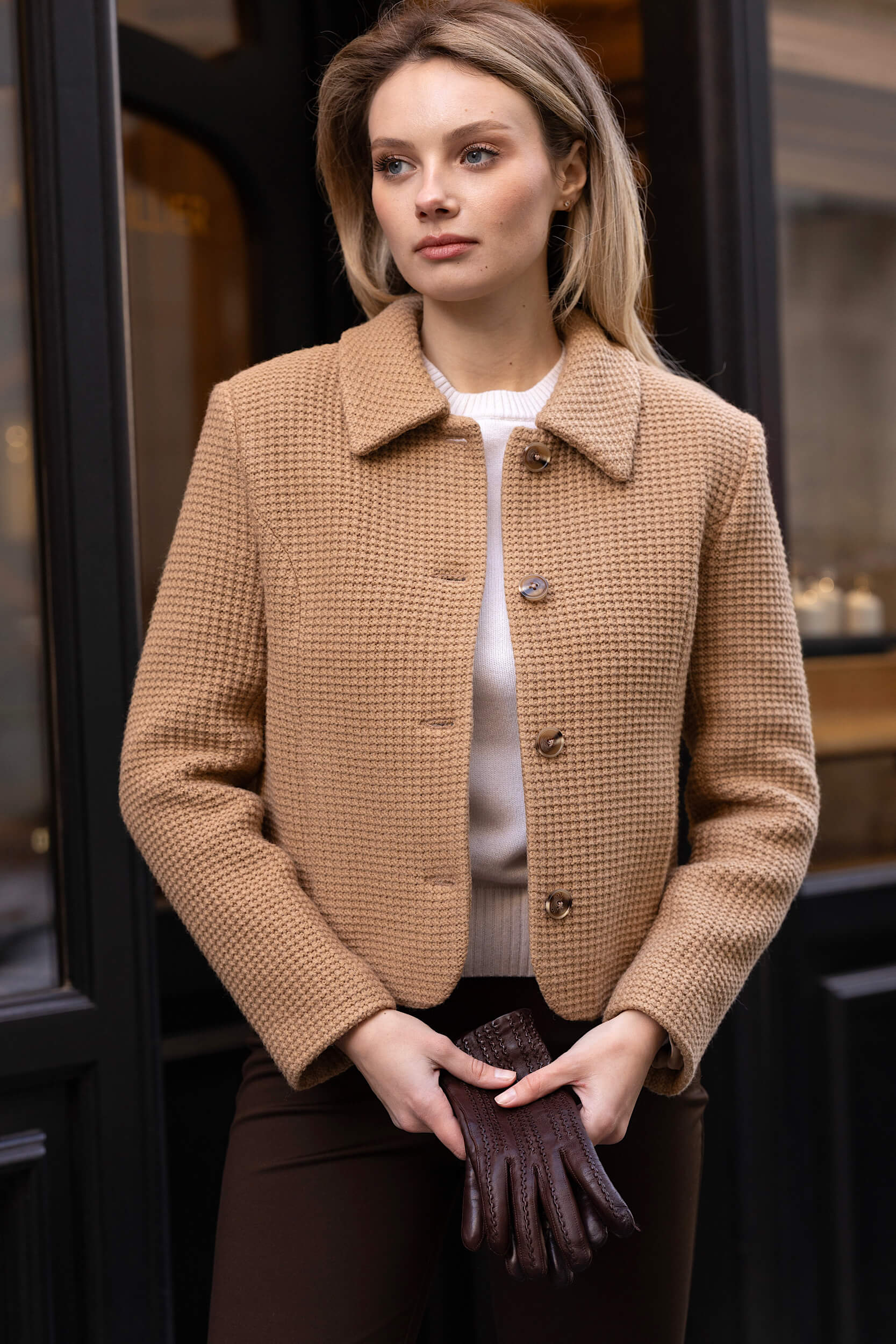 This short coat is crafted from premium upcycled wool and fully lined. It features a straight silhouette with a button-down front, a shirt collar, and rounded edges. Front reliefs are finished with integrated pockets for a refined finish.