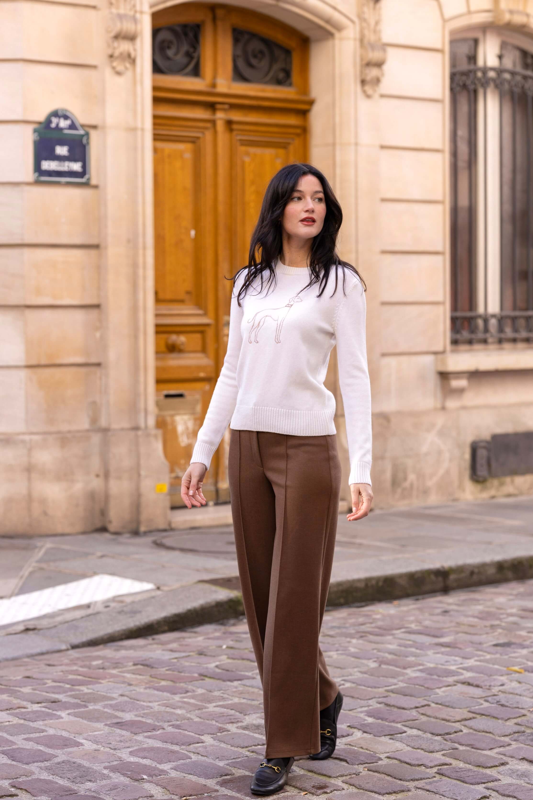 These pants are crafted from from durable upcycled cotton. Designed with a high waist and straight legs, they feature sharp form creases for a structured fit, a front zipper with button closure, and belt loops.