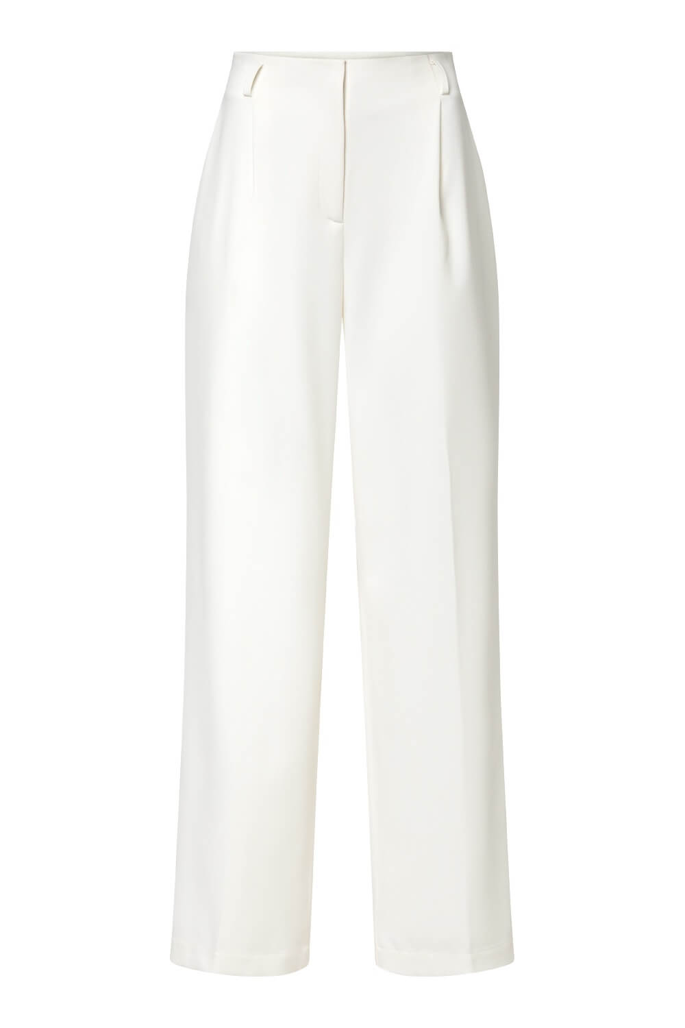 These trousers are created in a white upcycled polyester blend, fully lined with viscose. Designed with a high waist and a straight-leg cut, the silhouette features in-seam front pockets, back imitation welt pockets, and pleats. Additional details include belt loops and a front clasp with a zipper and two hidden buttons for a clean finish.