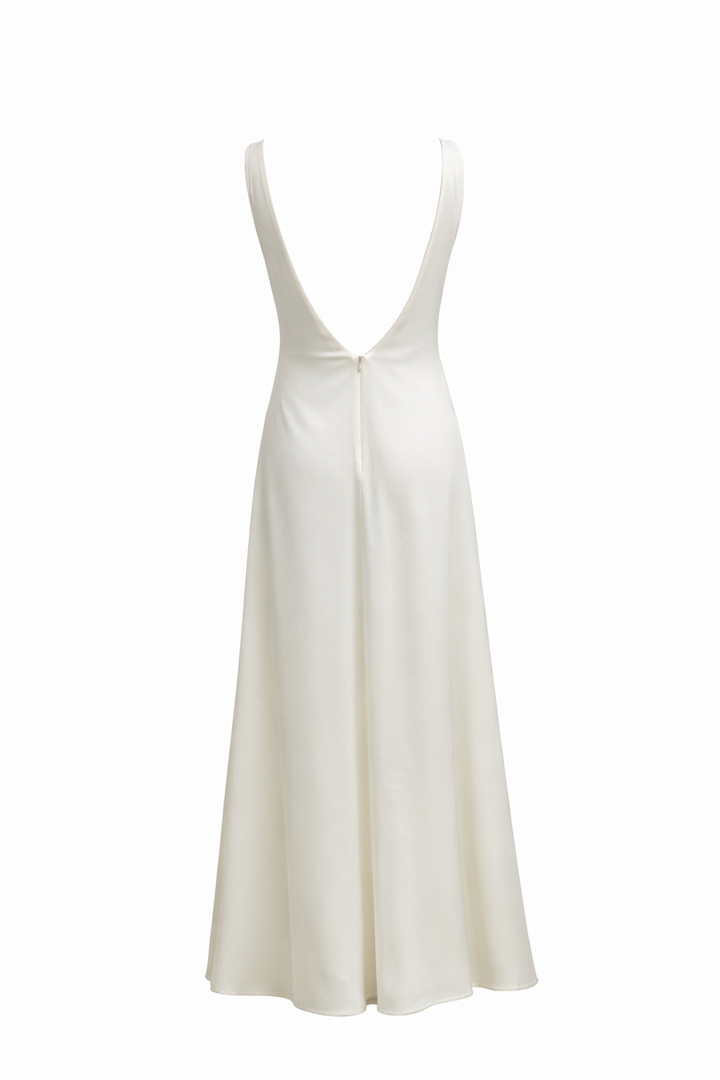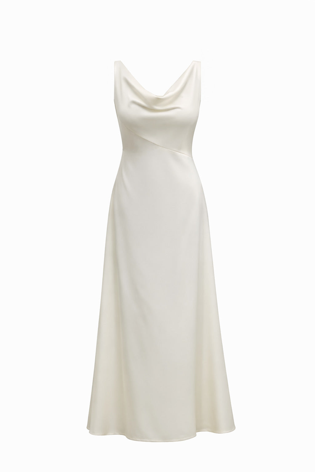 This maxi dress is crafted from superior upcycled acetate heavy crepe satin and is fully lined. It features a doubled cowl neckline and a maxi-length silhouette with an open back detailed with a gold-filled chain. The dress is finished with a back zipper.