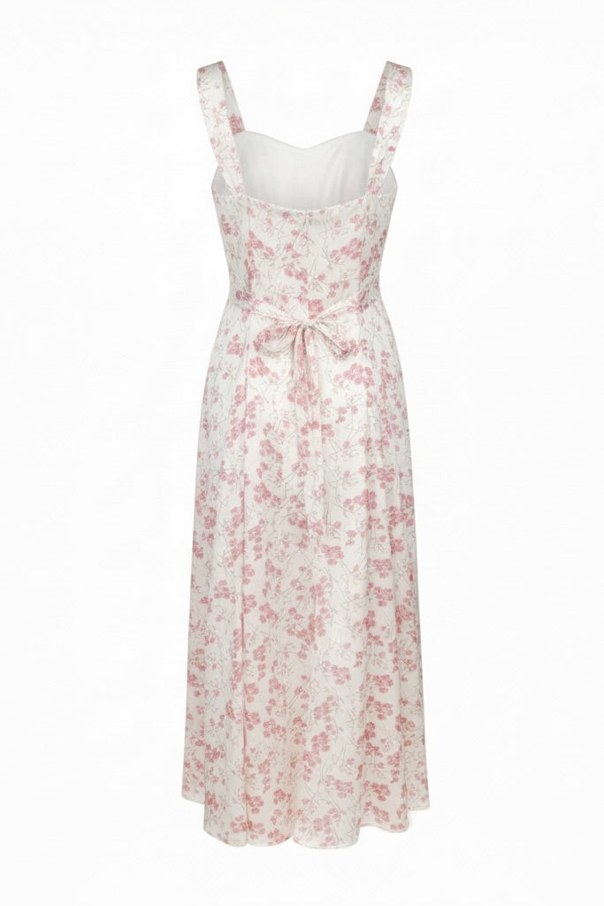 This dress is crafted from luxurious upcycled Matte Crepe de Chine silk with a viscose lining. It features a V-neckline and is cut under the bust for shaping. The midi-length, form-fitted silhouette is finished with a back zipper and an adjustable back tie for fit adjustment.