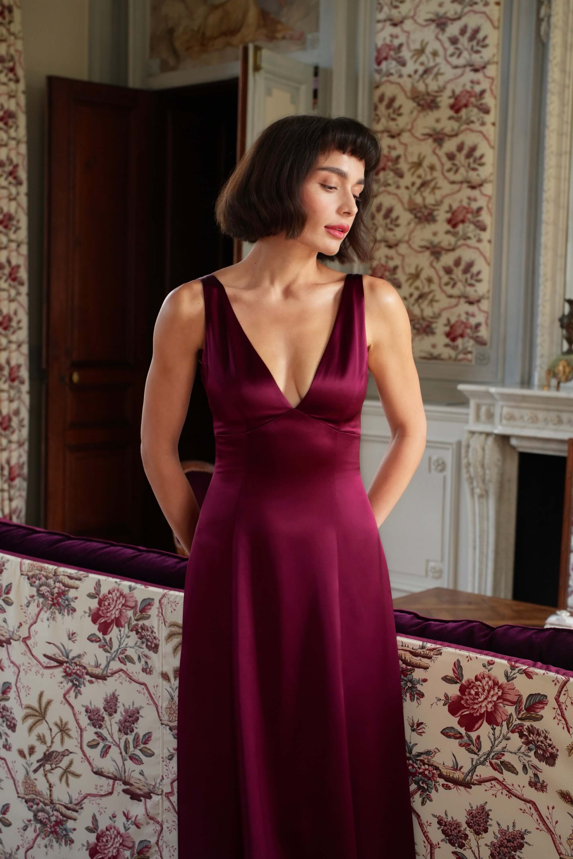 Created from premium upcycled triacetate and fully lined in viscose, this maxi dress features a plunging V-neckline and a fitted waist. The skirt gently flares with subtle relief detailing, while a concealed side zipper ensures a seamless fit.