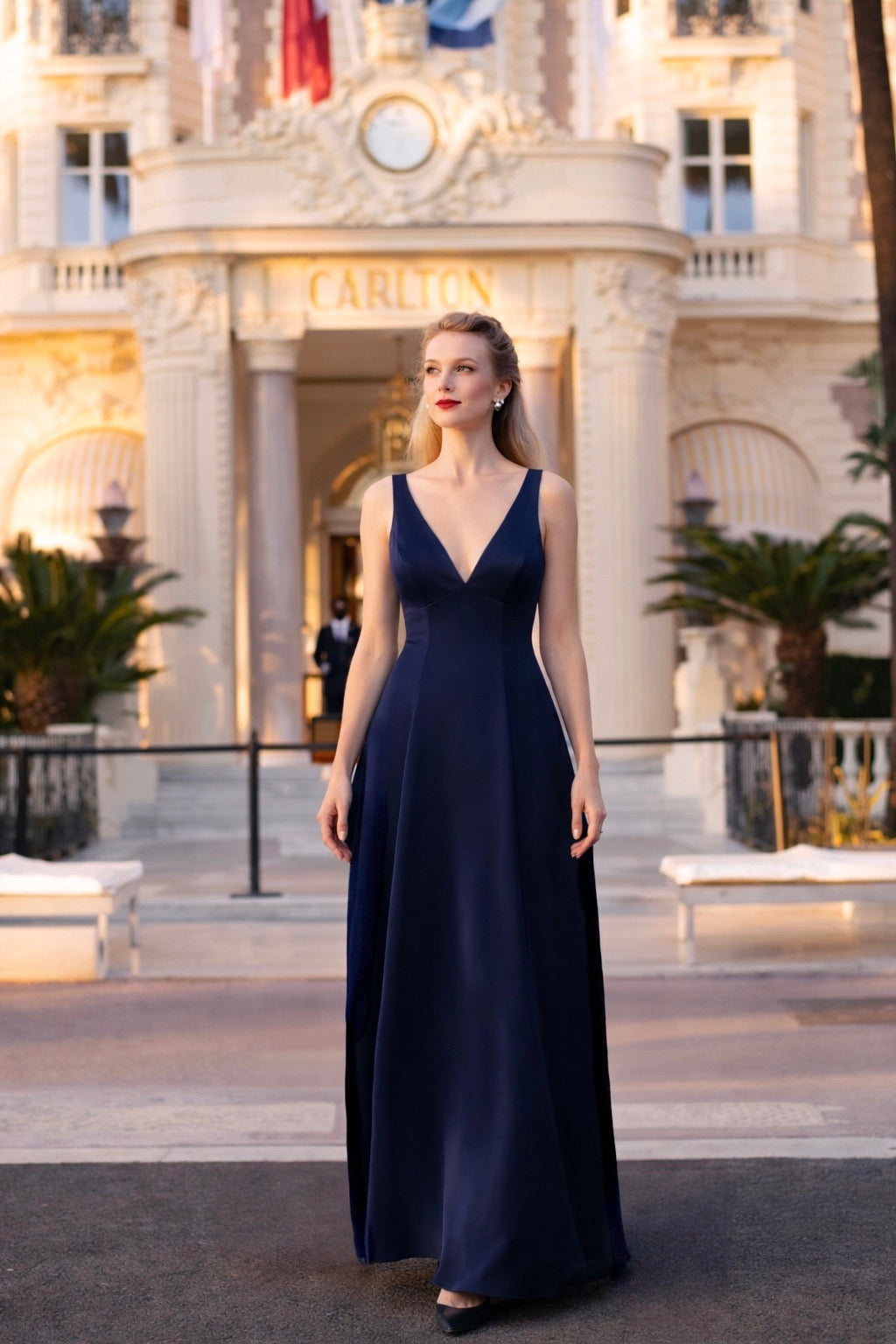 Created from premium upcycled triacetate and fully lined in viscose, this maxi dress features a plunging V-neckline and a fitted waist. The skirt gently flares with subtle relief detailing, while a concealed side zipper ensures a seamless fit.