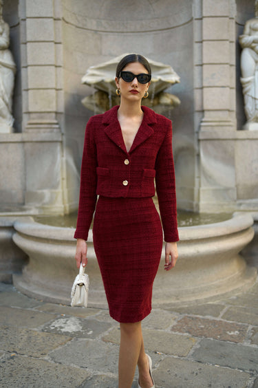 This set is crafted from soft upcycled tweed with a viscose lining. The cropped jacket adds a contemporary touch while maintaining a formal aesthetic, while a classic shirt collar and pockets give the jacket a professional edge, making it suitable for work events or formal events. The midi-skirt is a versatile piece that perfectly complements the cropped jacket.