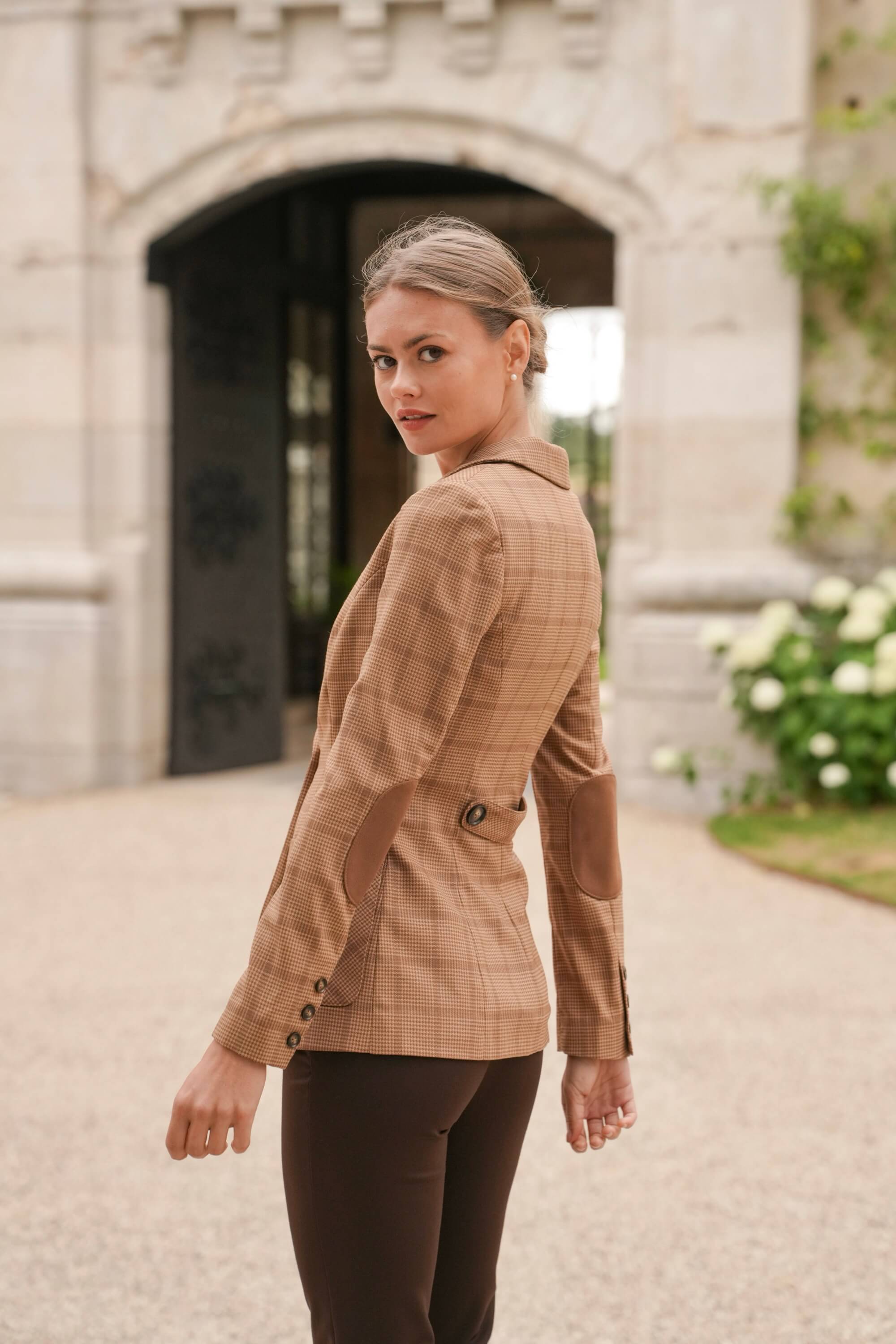 Created in durable upcycled wool, this short coat features a rounded hem and a single-breasted front with one button closure and a notched collar. Long sleeves are finished with button details at the cuffs. A removable back strap provides aesthetic, while contrast elbow patches add subtle detailing.
