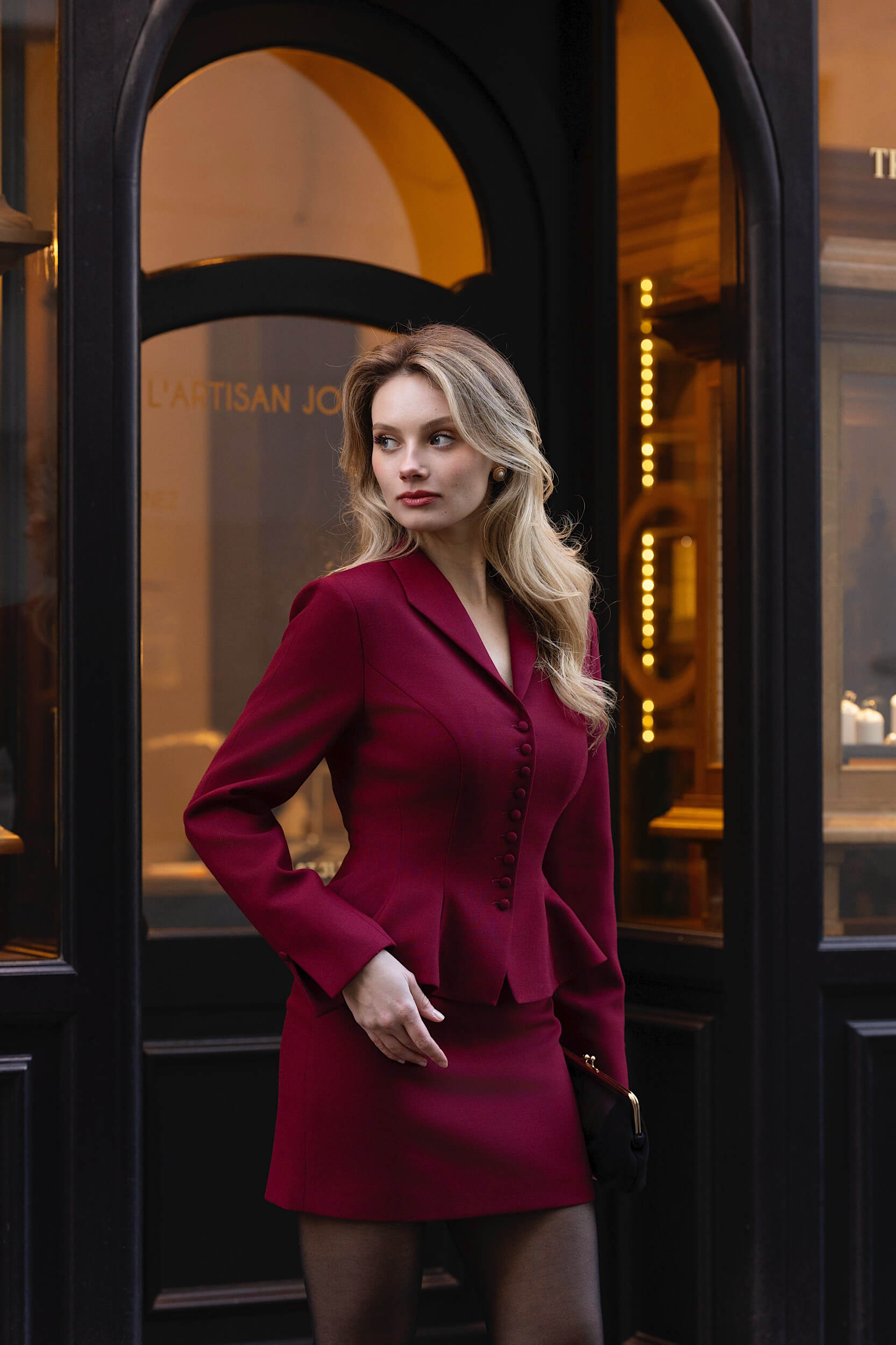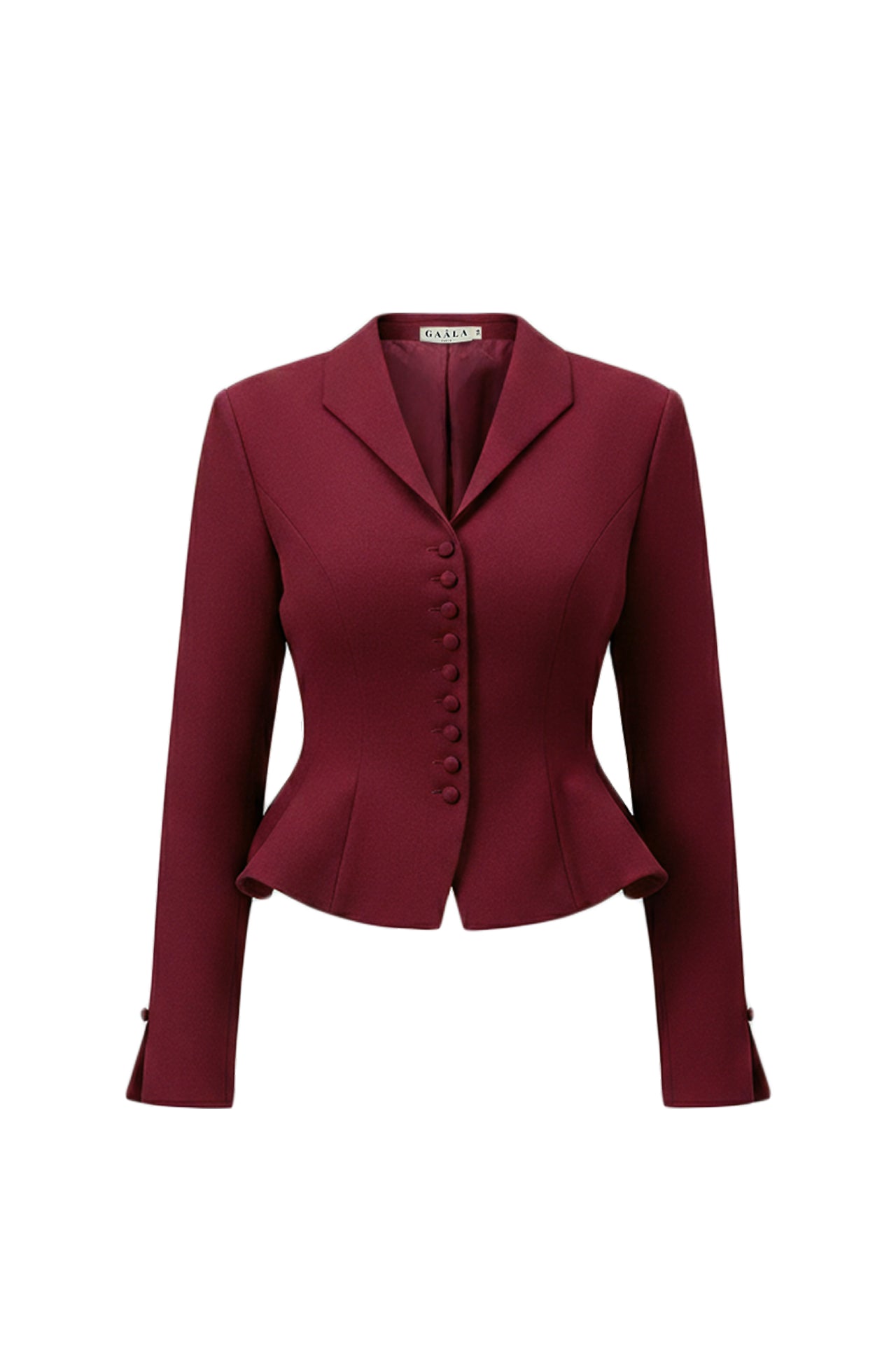 This button-down jacket is crafted from a premium upcycled wool-viscose blend and features a fully lined interior for a smooth, structured fit. Form-fitted through the waist with a softly flared peplum hem, it boasts an A-line collar, long sleeves with subtle cut details, and a hip-length silhouette.