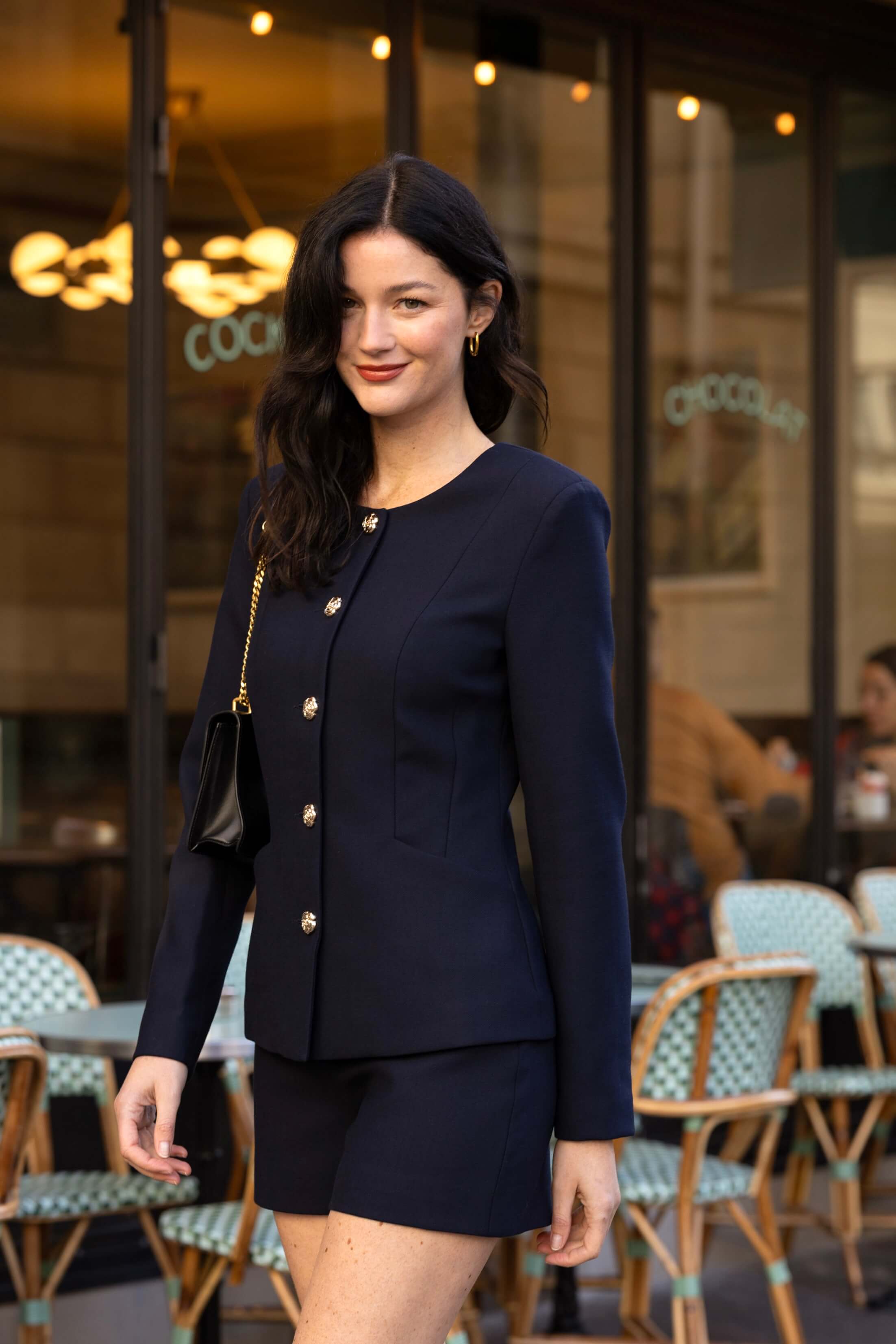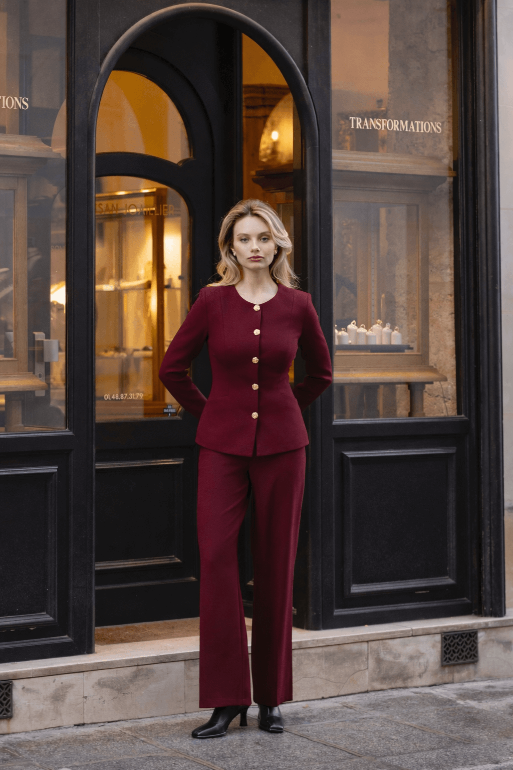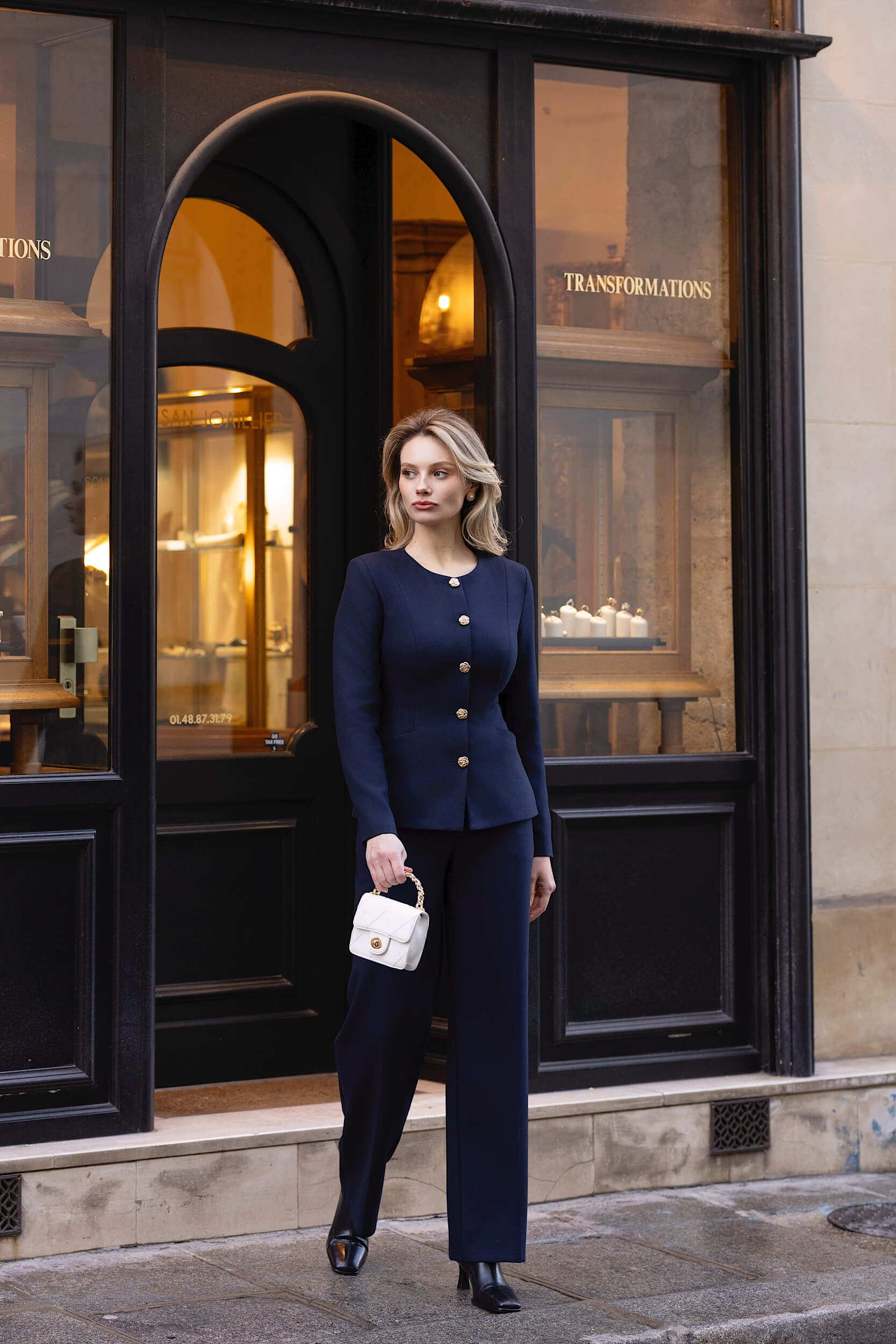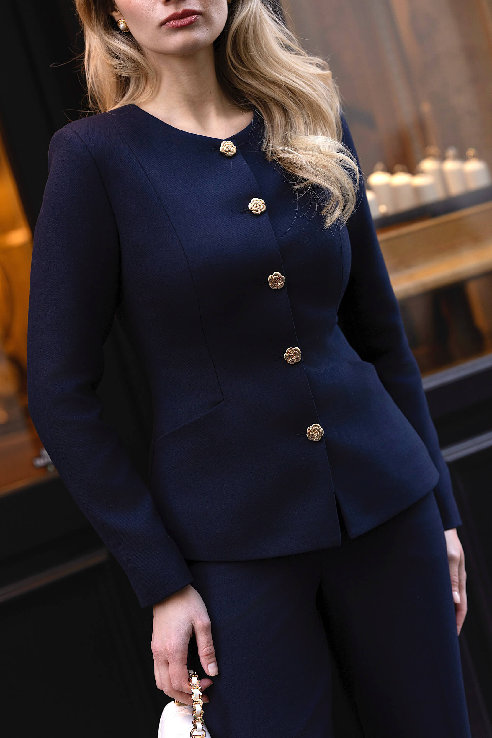 This jacket is created from the finest upcycled wool and fully lined. It jacket features a high, rounded neckline, long sleeves, tailored reliefs, and angled front pockets.
