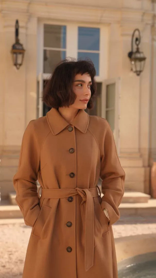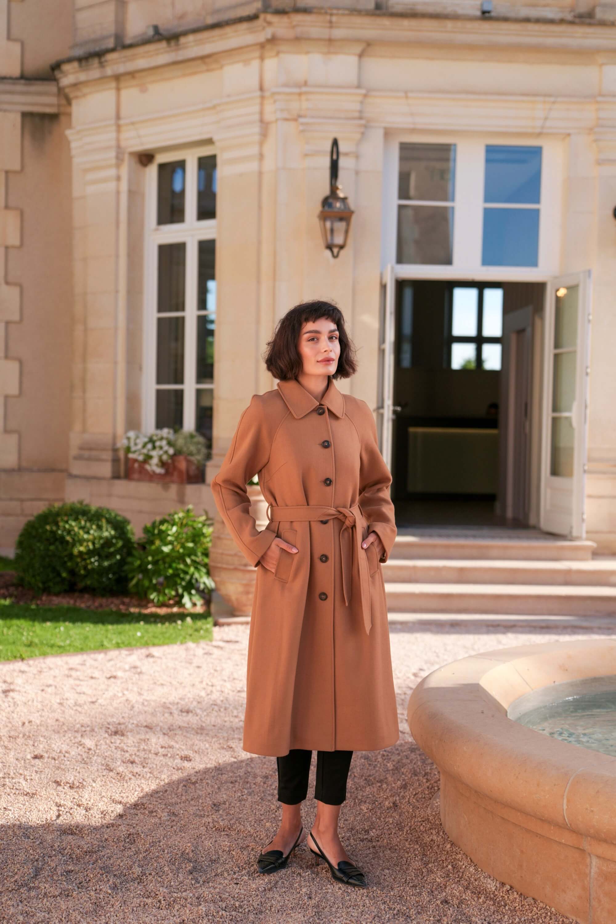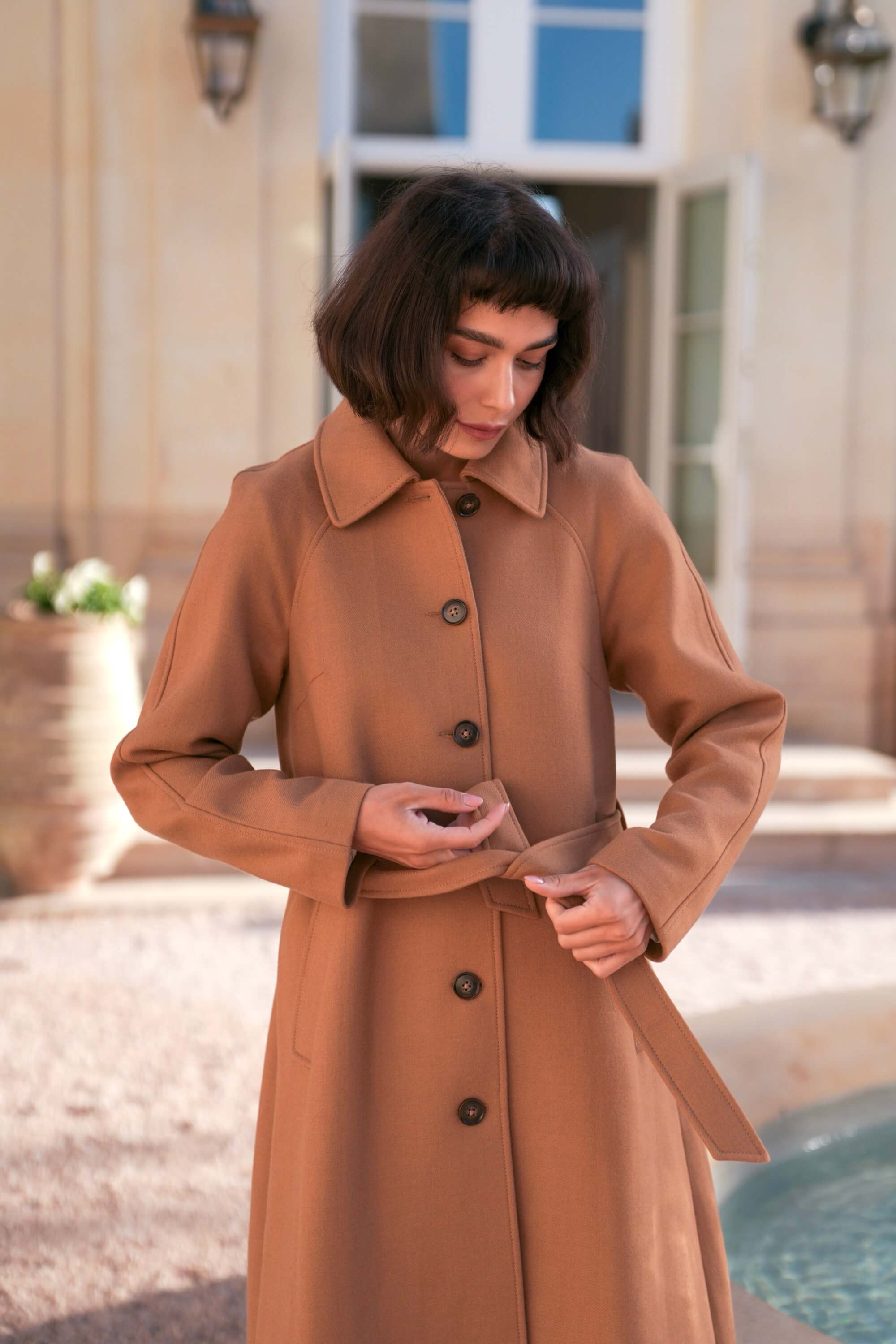 This coat is crafted from durable upcycled wool with a lining. It features an A-line silhouette, single-breasted closure, raglan sleeves, and belt loops. The design is finished with a removable belt and discreet welt pockets.