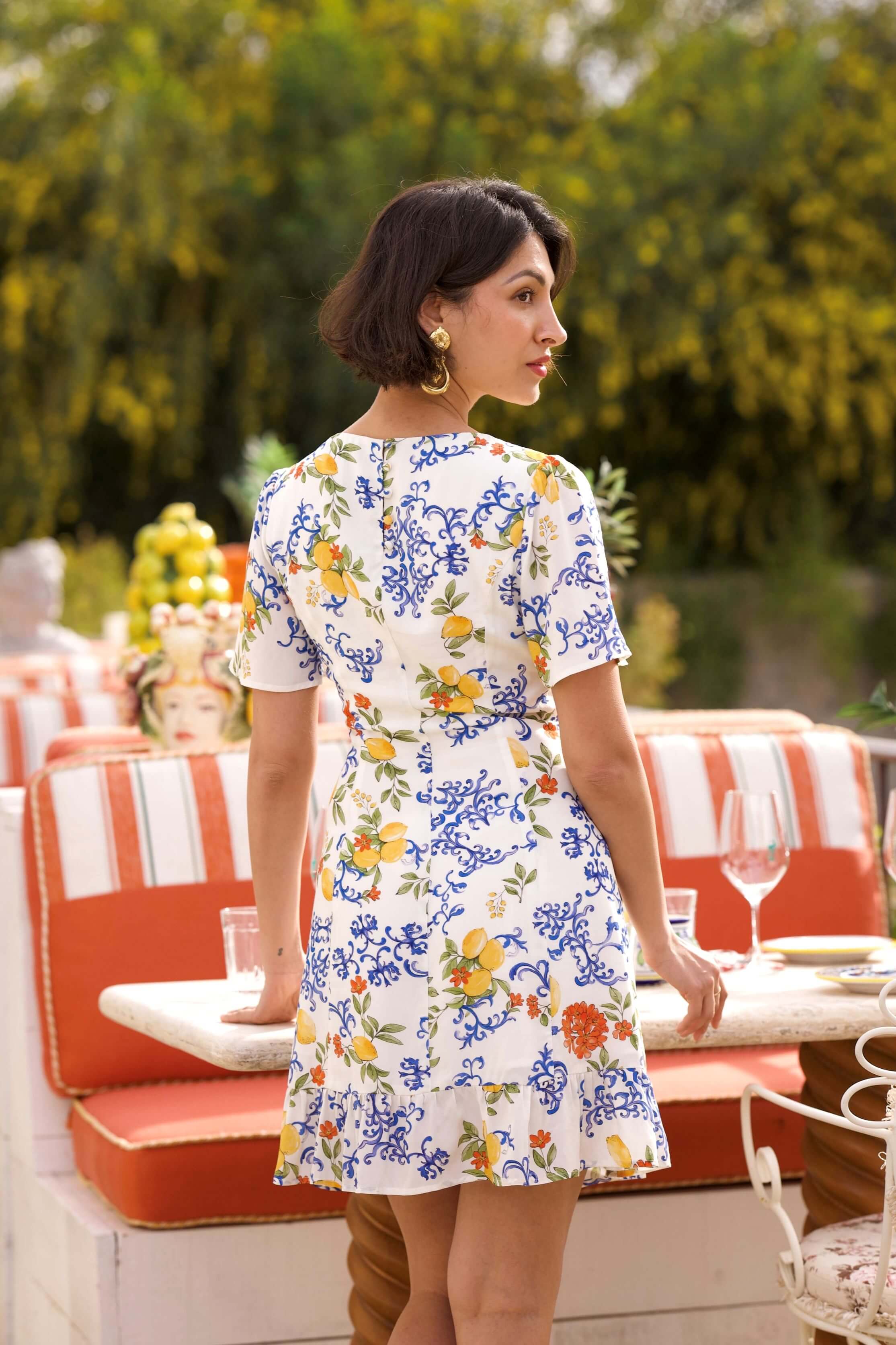 Featuring our Sicily print, designed in-house and crafted by our artisan, this mini dress is made from a sustainable viscose-rayon blend. It features a high round neckline and a fit-and-flare silhouette with a fitted waist and an A-line skirt finished with a ruffled hem. Functional back buttons provide a secure closure.