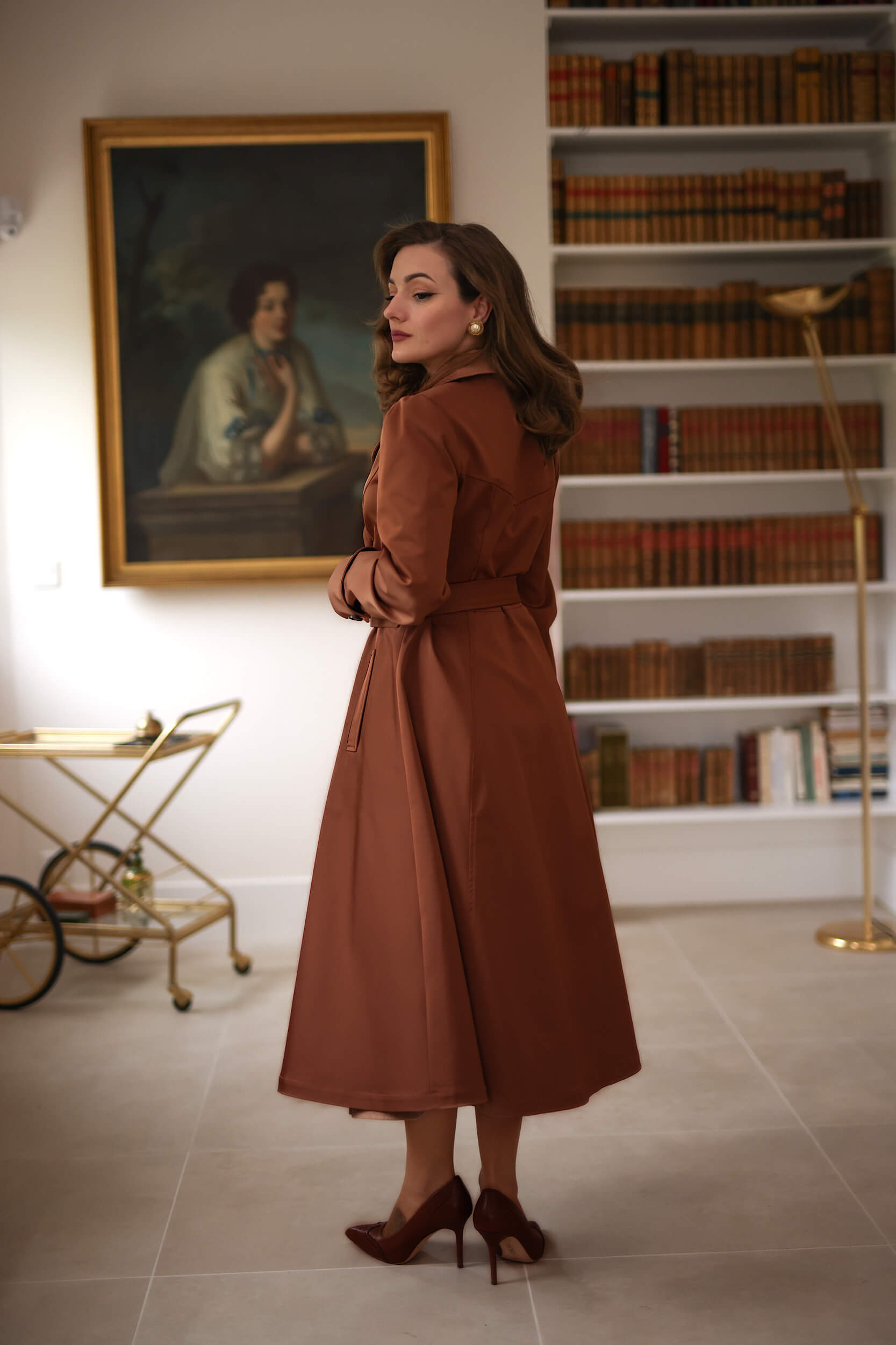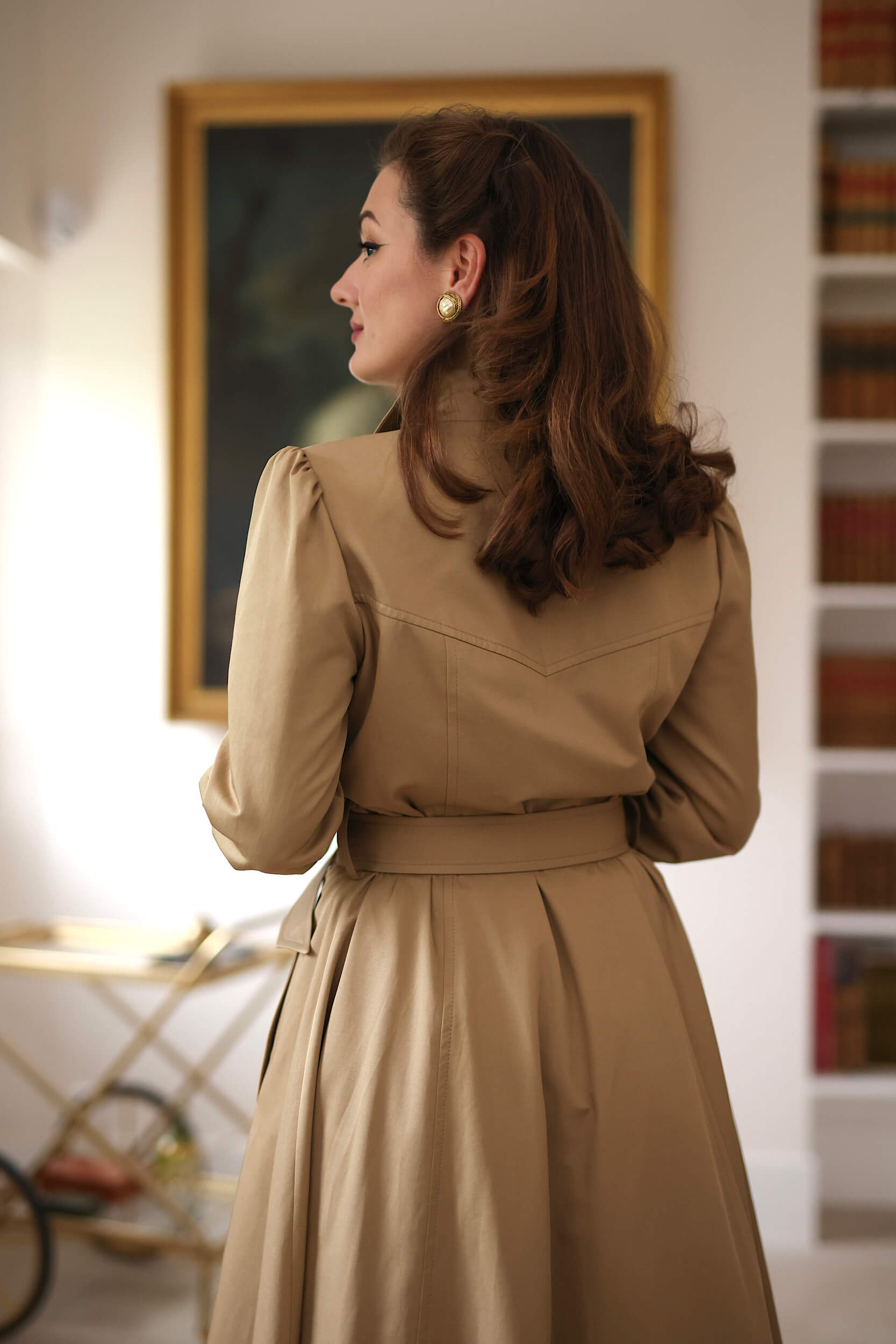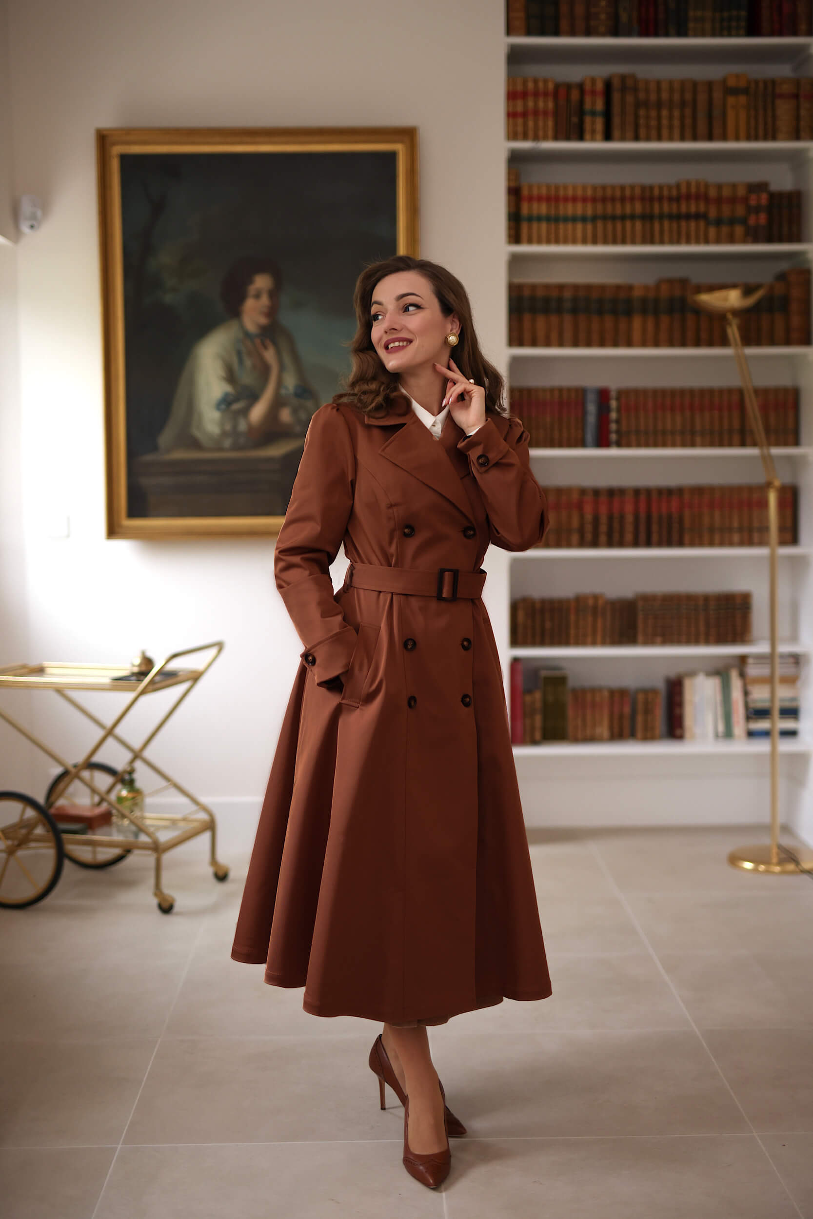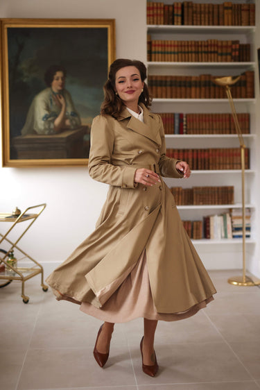 “Our vintage-inspired Anastasiia trench coat embodies vintage sophistication with a 1940s-1950s flair, reminiscent of classic films from that era. Crafted from high-quality fabrics, it features a double-breasted design, a tailored fit, and a swinging skirt that adds graceful movement. The pointed waistline accentuates the elegance of the coat, enhancing its refined, cinematic style. Finished in rich, muted colors like camel and classic beige, it captures a timeless, sophisticated charm.”  – Anastasiia