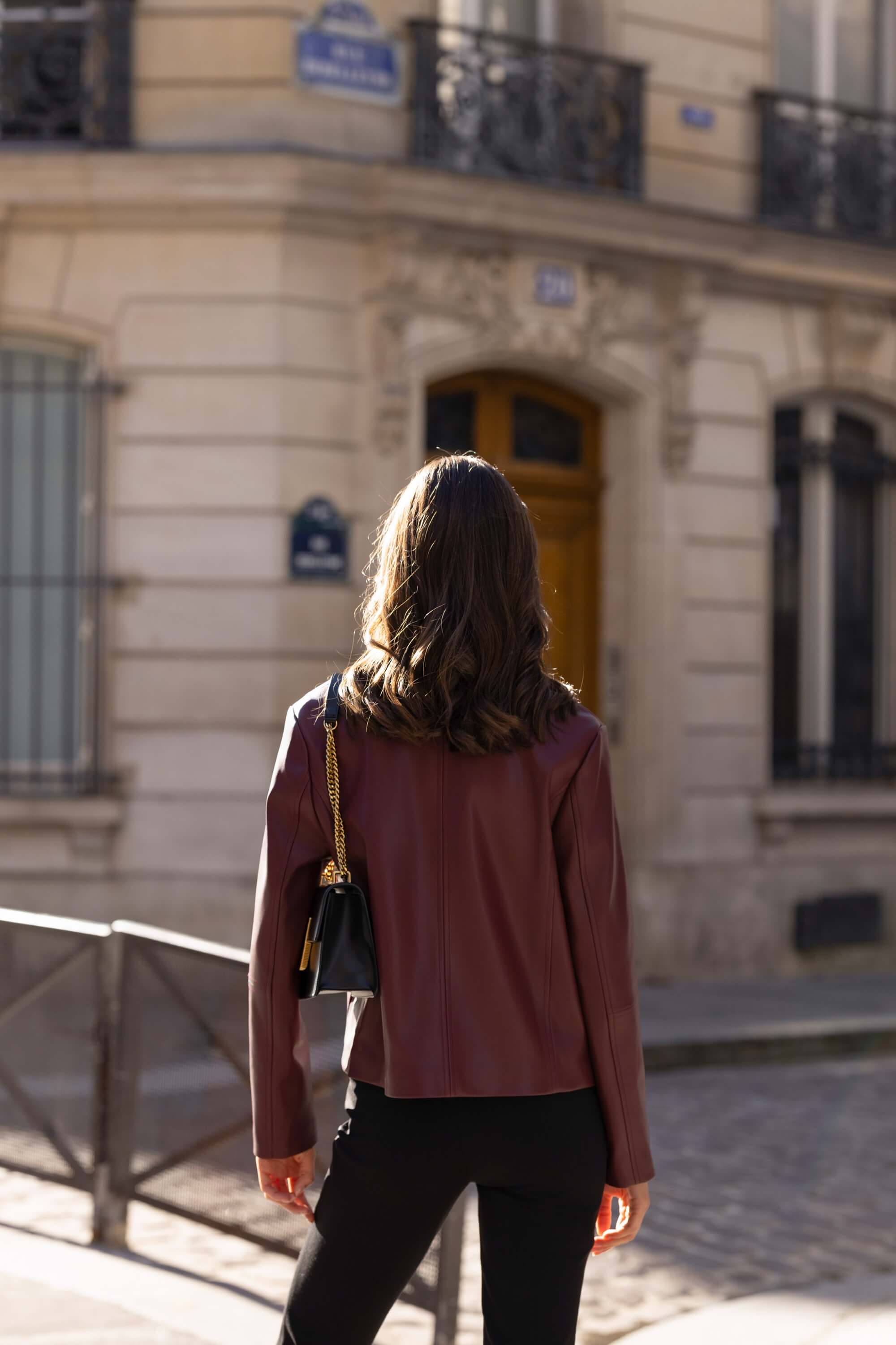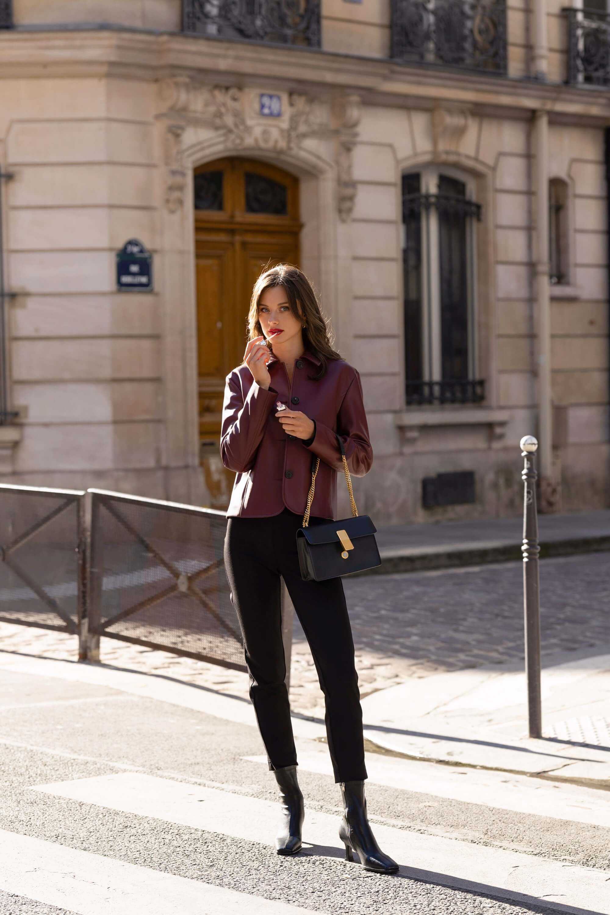 This fully lined short coat is crafted from upcycled faux leather with a soft, smooth finish. It features a straight silhouette with a button-down front, a shirt collar, and rounded edges. Front reliefs are finished with integrated pockets, while decorative horizontal sleeve cuts complete the design.