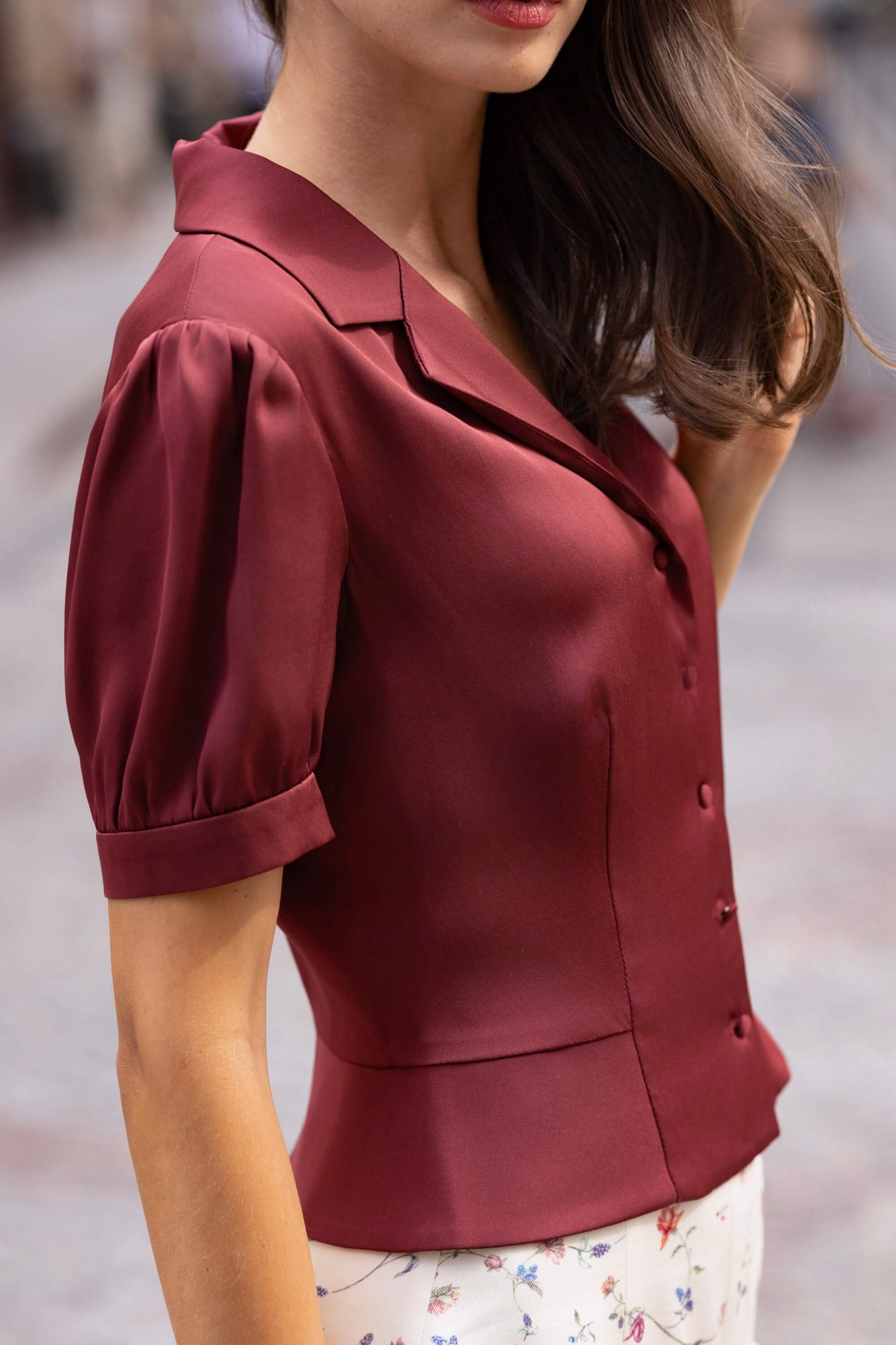 This blouse is crafted from luxurious upcycled Crepe Georgette mulberry stretch silk and lined with silk elastane. Designed in a gentle peplum silhouette, it features puff sleeves, a classic collar, and a button-down front.