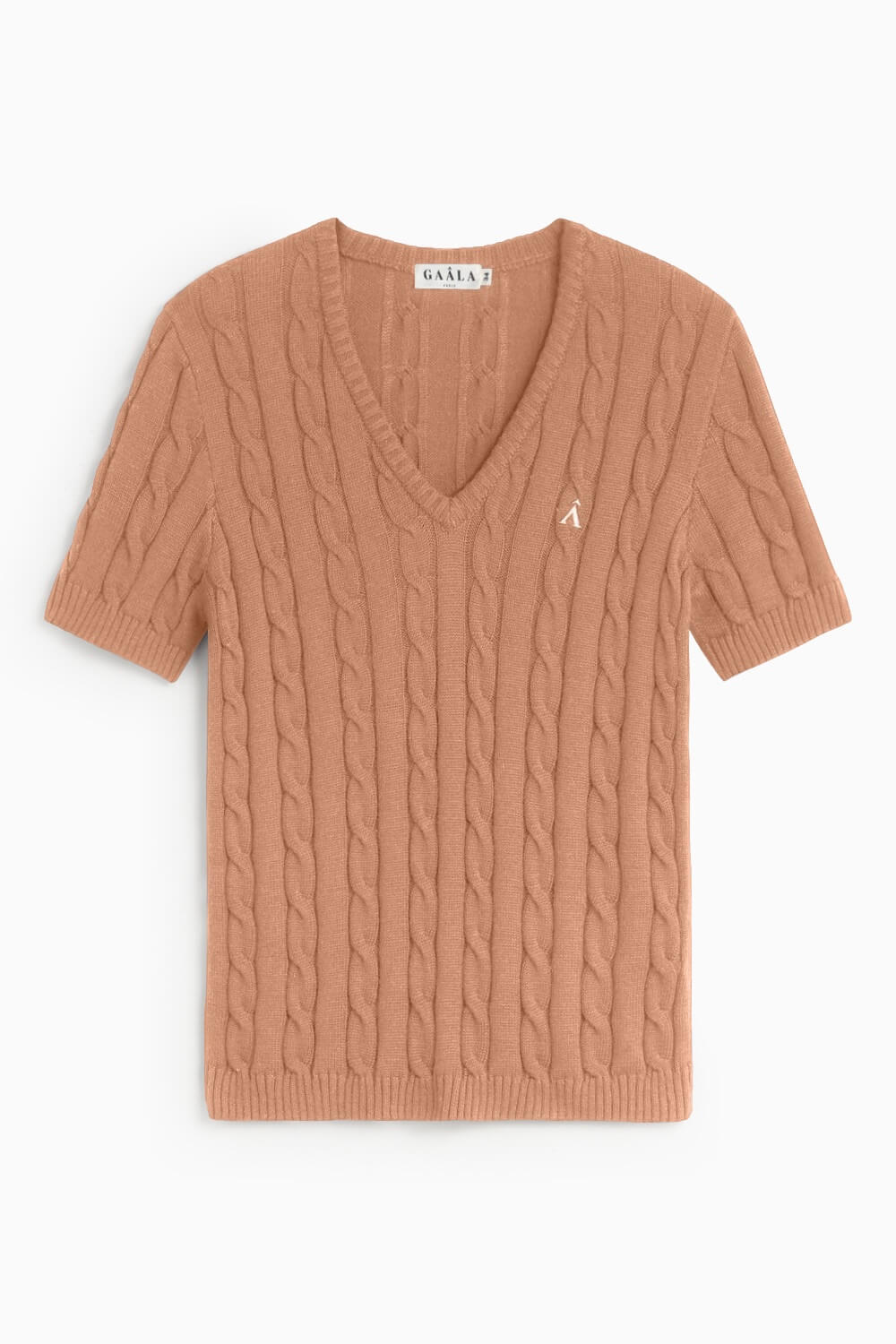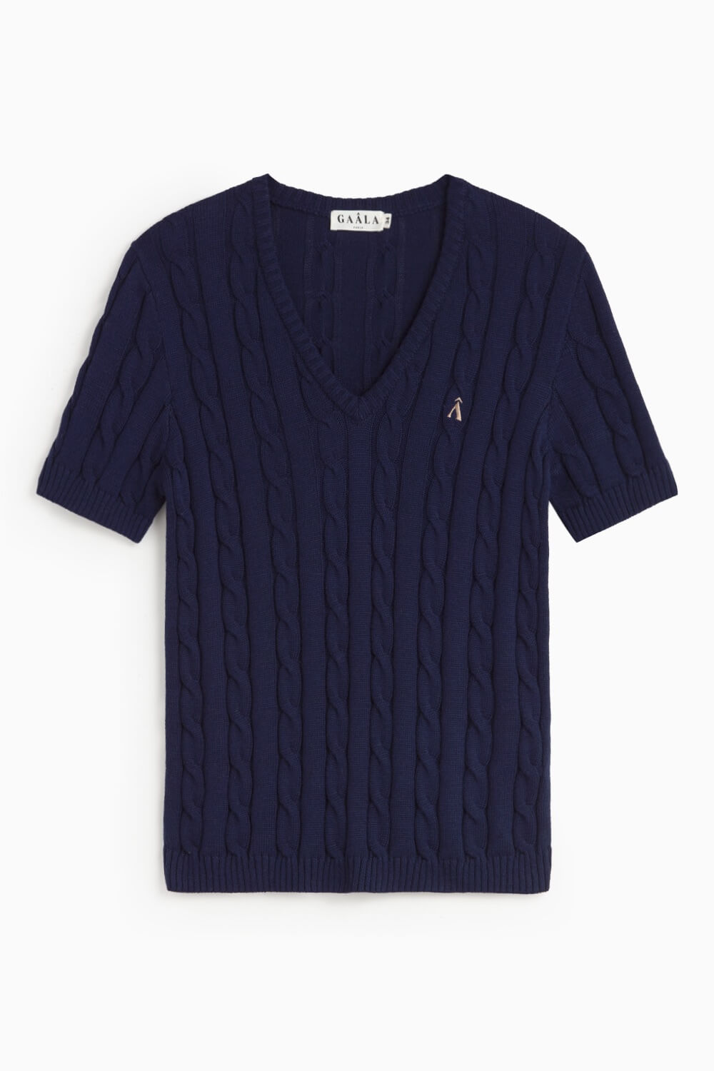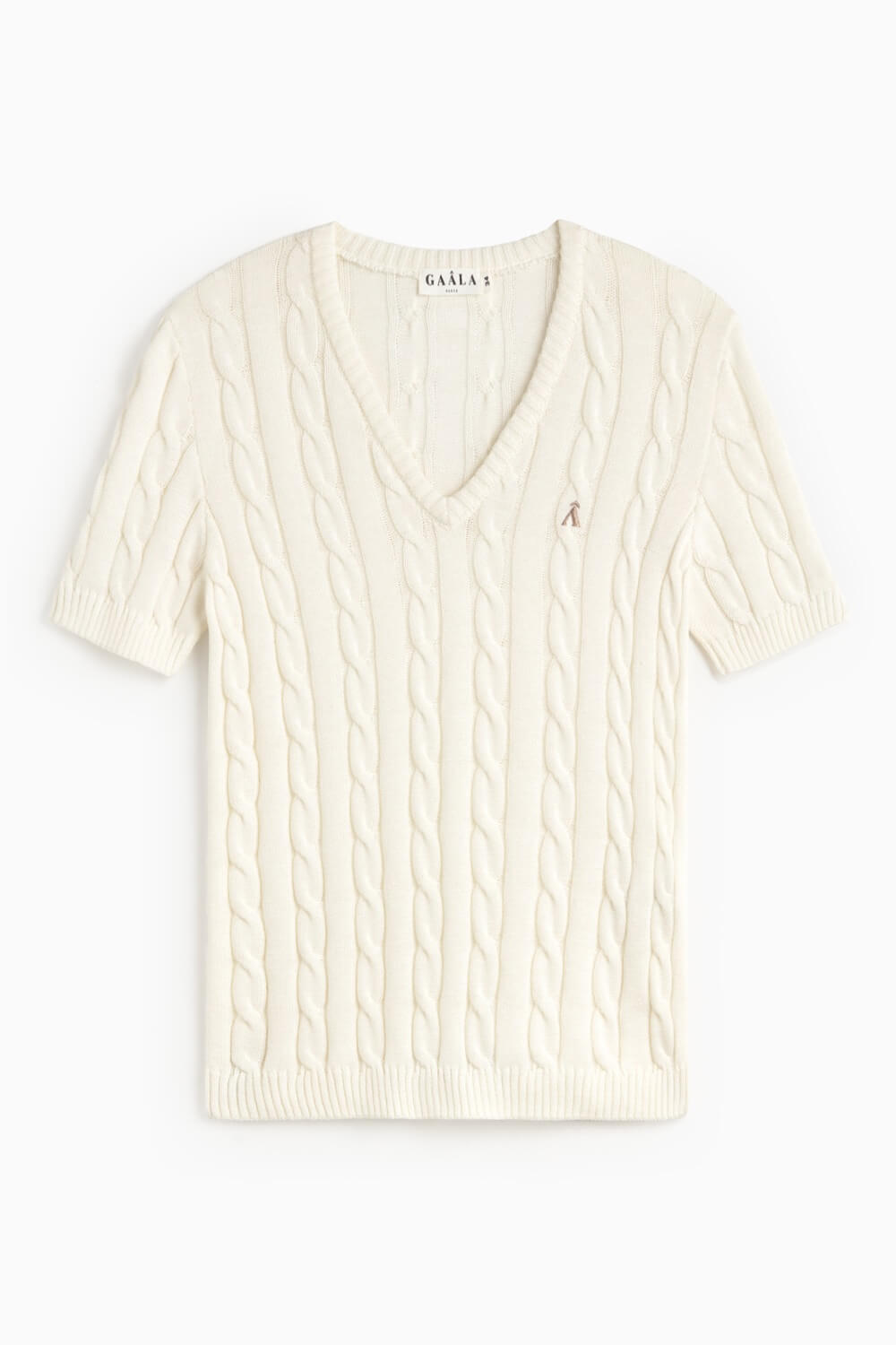 This top is machine knit with a classic cable knit pattern, crafted from a premium blend of organic cotton and cashmere. Cut in a form-fitting, hip-length silhouette; it features a v-neckline, short sleeves, and an embroidered Gaâla logo.