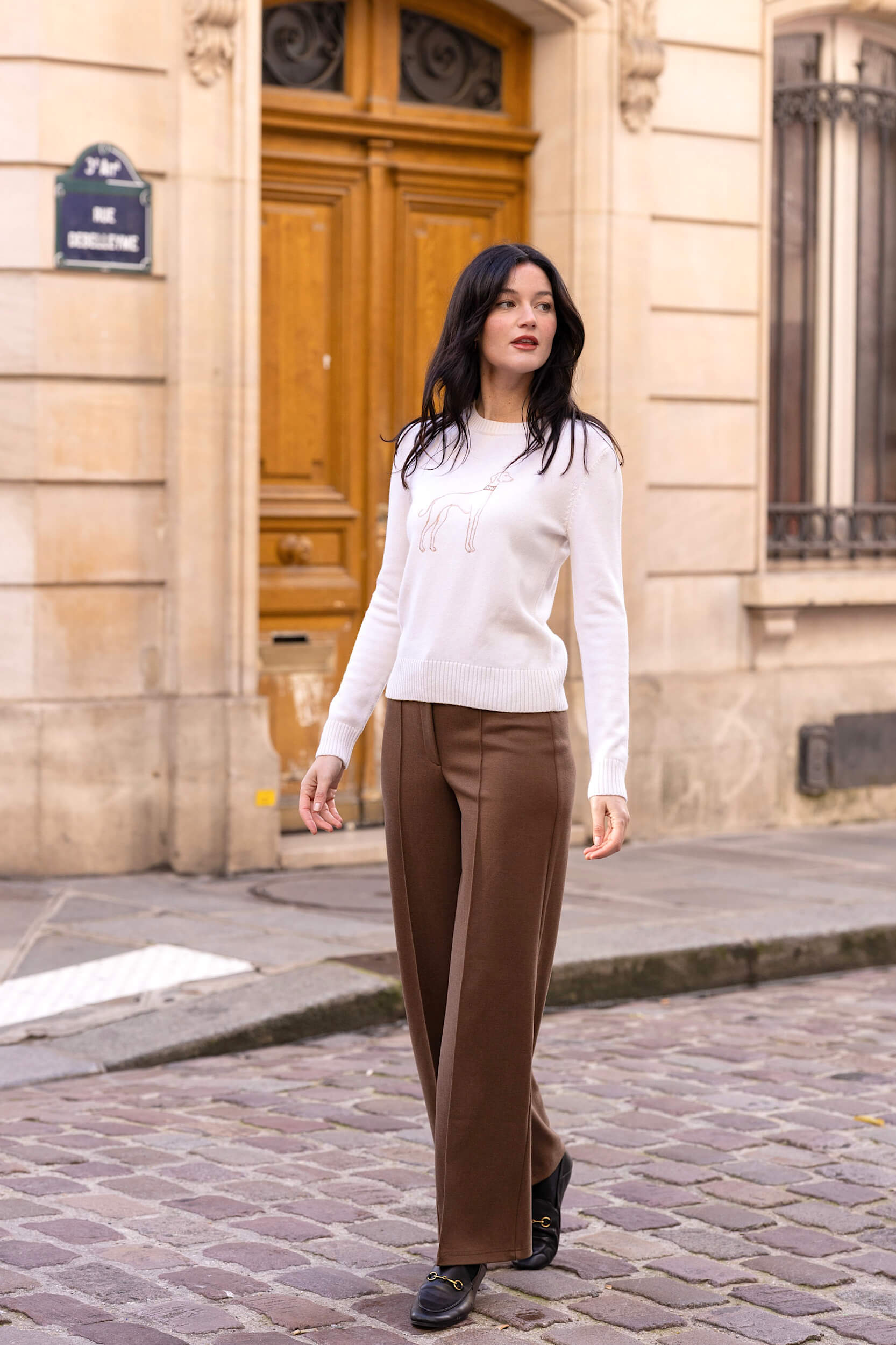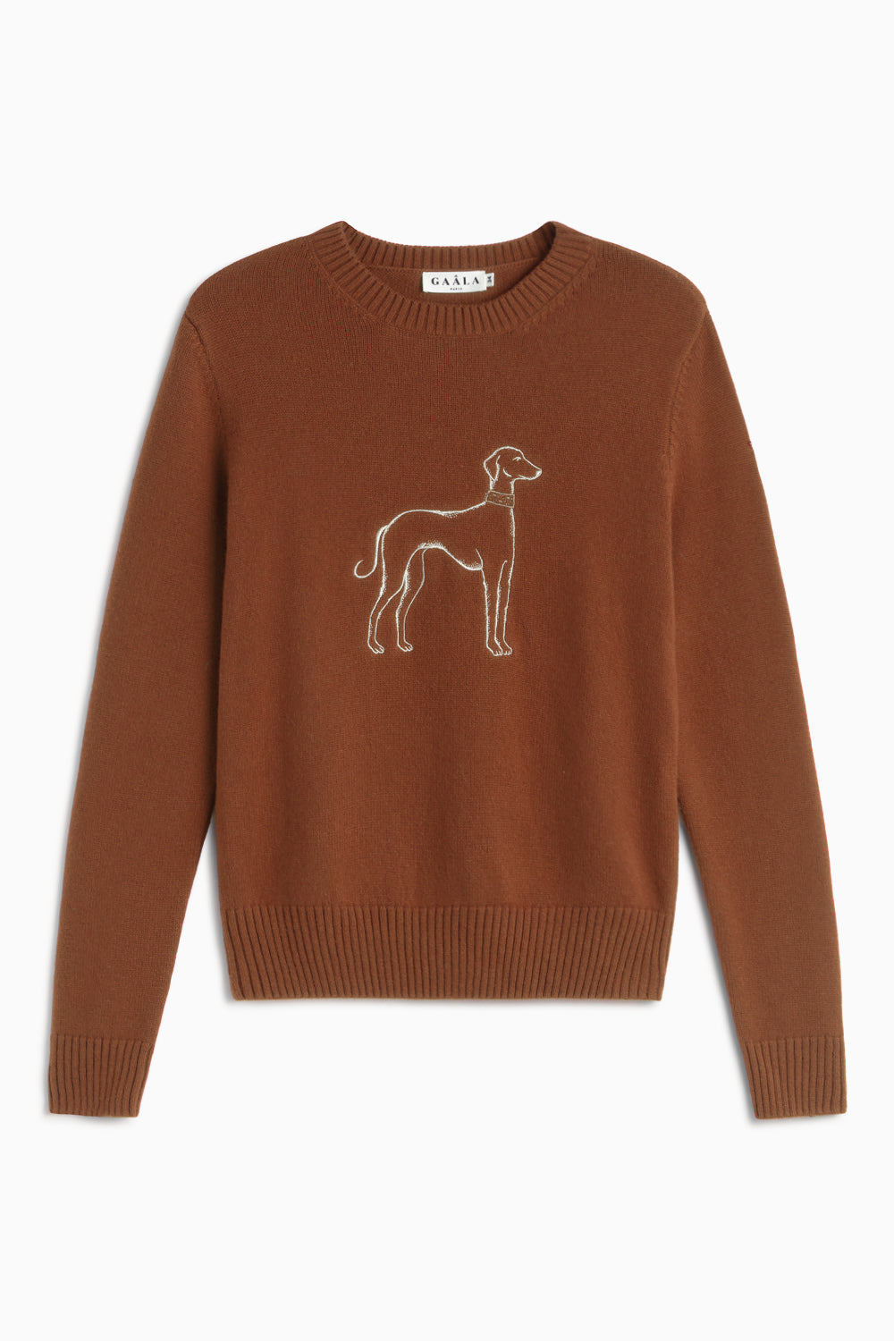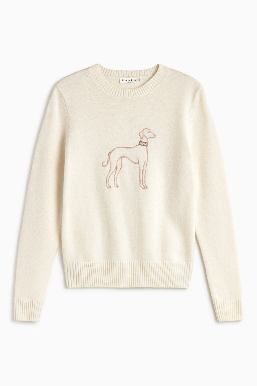 This classic crewneck sweater is machine-knit from a soft blend of superfine wool and cashmere. It features a clean silhouette and is finished with a machine-embroidered hound motif—an original illustration developed in-house by our artisan.