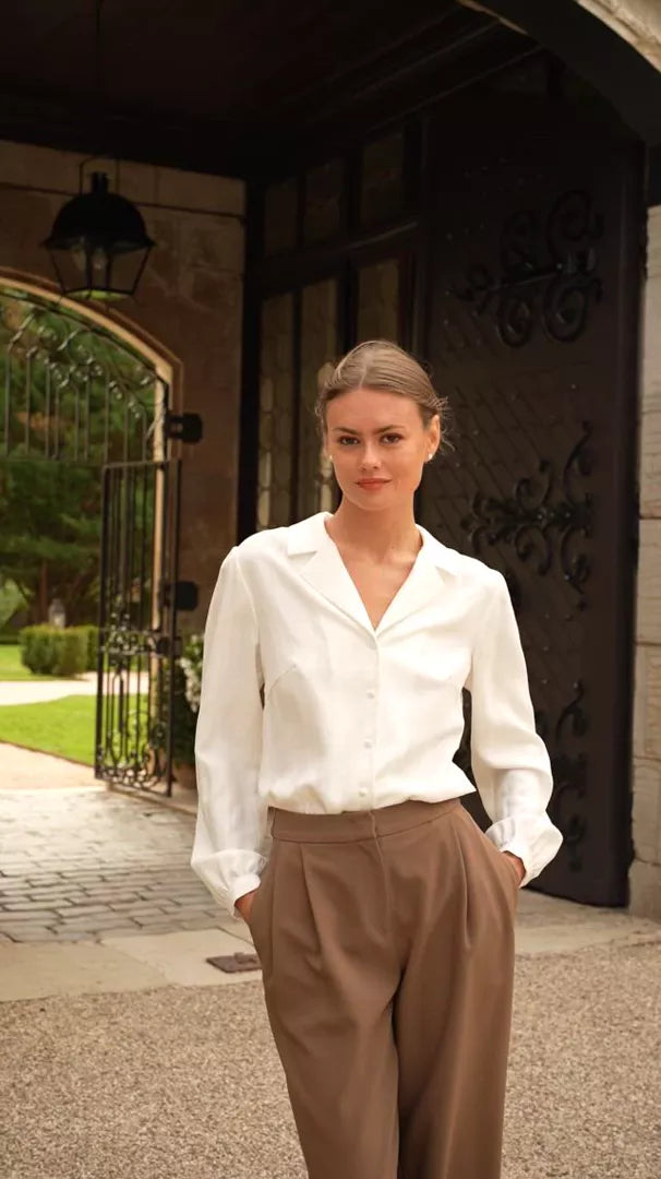 This blouse features a button-down design with a relaxed fit and long sleeves, finished with button cuffs and a v-neckline framed by a classic collar. The blouse’s length facilitates effortless tucking.