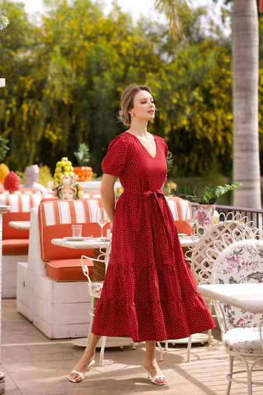 Crafted from breathable cotton with a viscose lining, this midi dress features a relaxed, loose fit shaped with a removable belt. The V-neckline frames the décolleté, while short sleeves with bottom seams create a soft bell shape. Gentle gathering at the waistline enhances the silhouette, and the flounced skirt adds movement and fluidity.