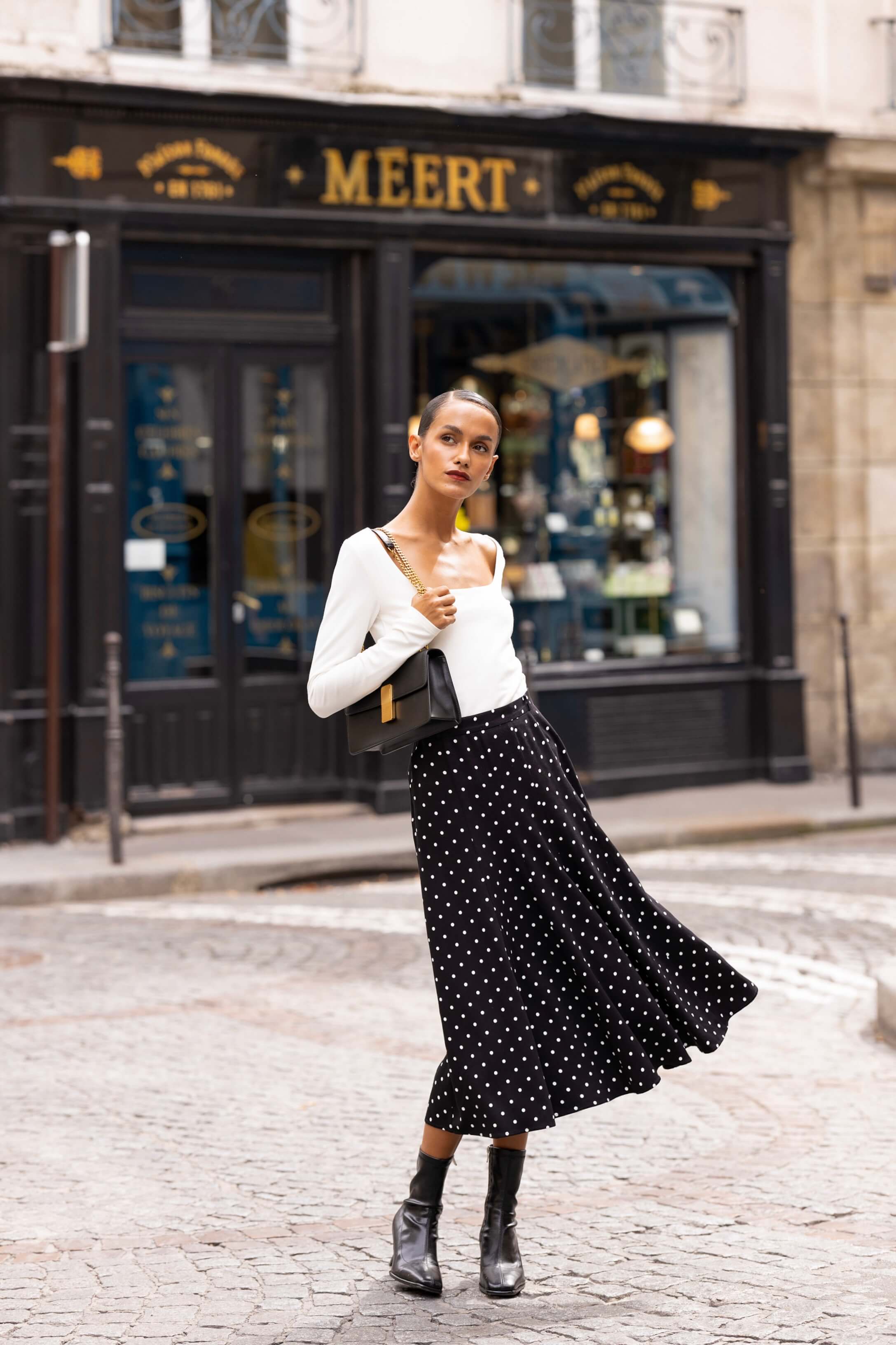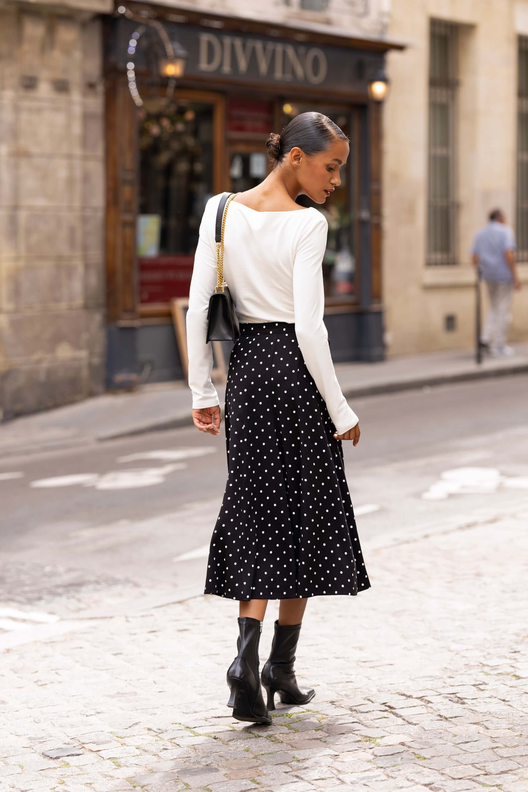 This skirt is crafted from premium upcycled heavy rayon and showcases a midi length with a flowing godet silhouette, a side zipper, and belt loops.
