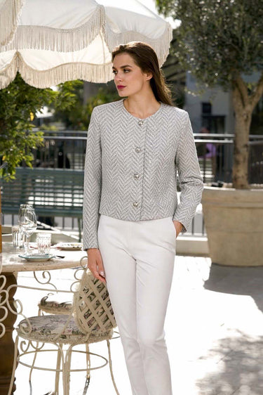 This lightweight short coat jacket is tailored from the finest upcycled wool and fully lined. Designed with a boxy cut, it features long sleeves, a button-down front, and a rounded collar.