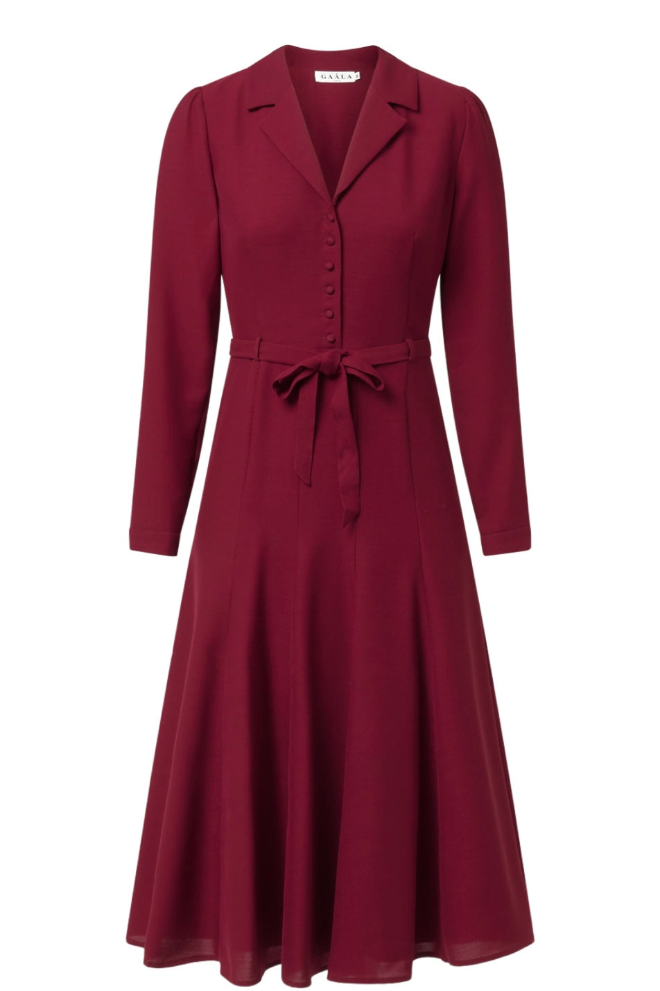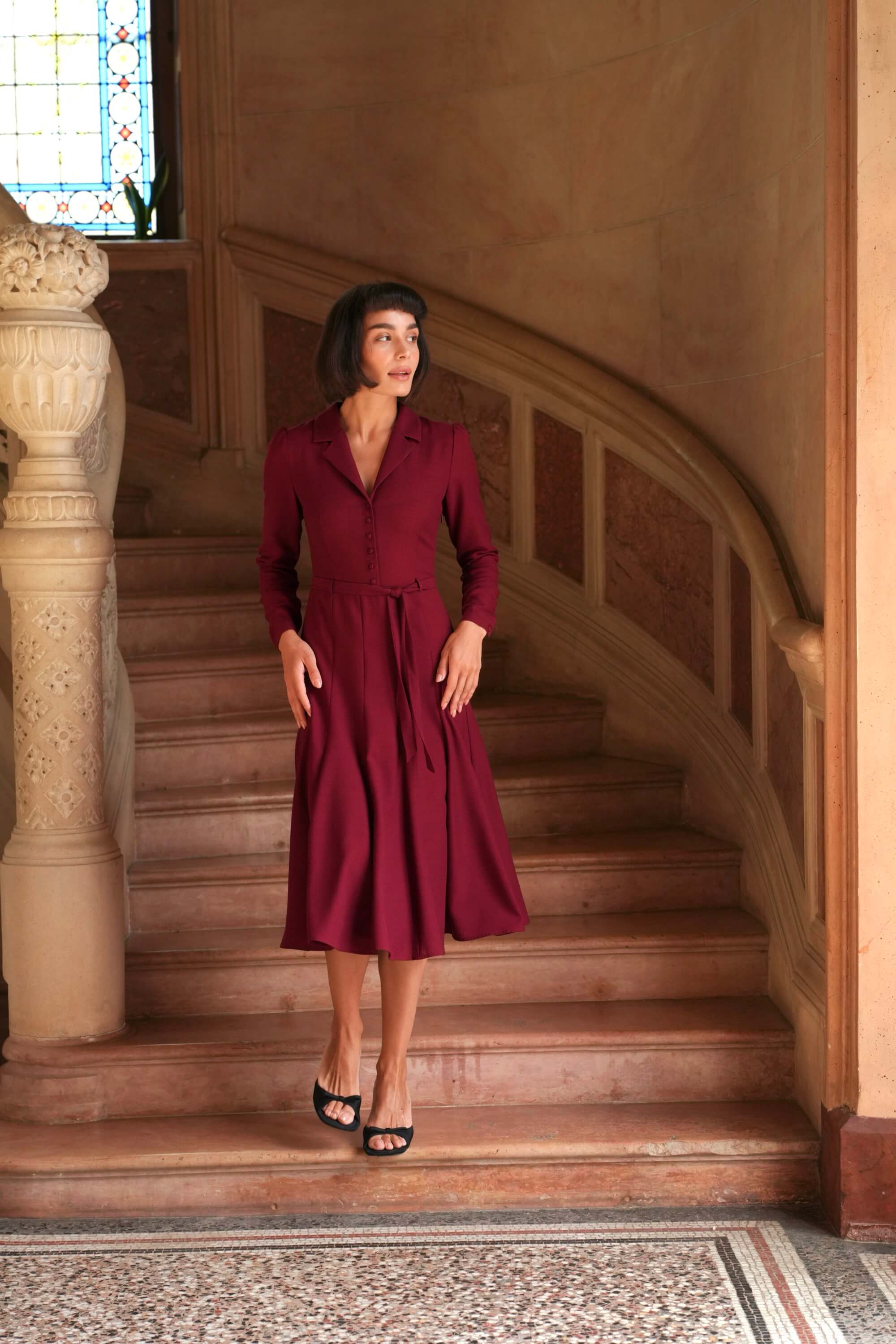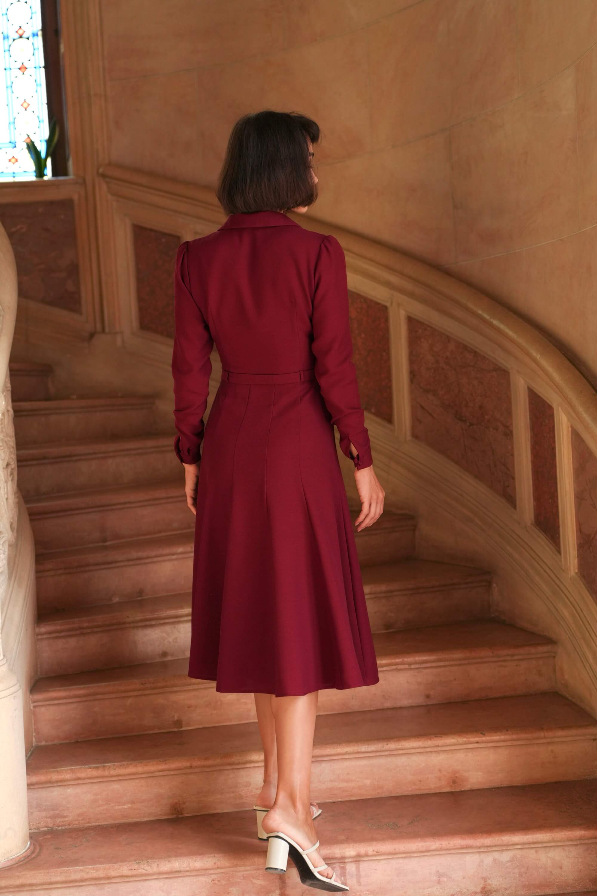 Crafted from a premium upcycled acetate-wool blend, this dress features a notched collar, long sleeves, and functional front buttons. The bodice is doubled with the main fabric, while the skirt is lined in viscose. Belt loops and a detachable tie belt define the waist, leading to a godet skirt. The silhouette is finished with a concealed side zipper.