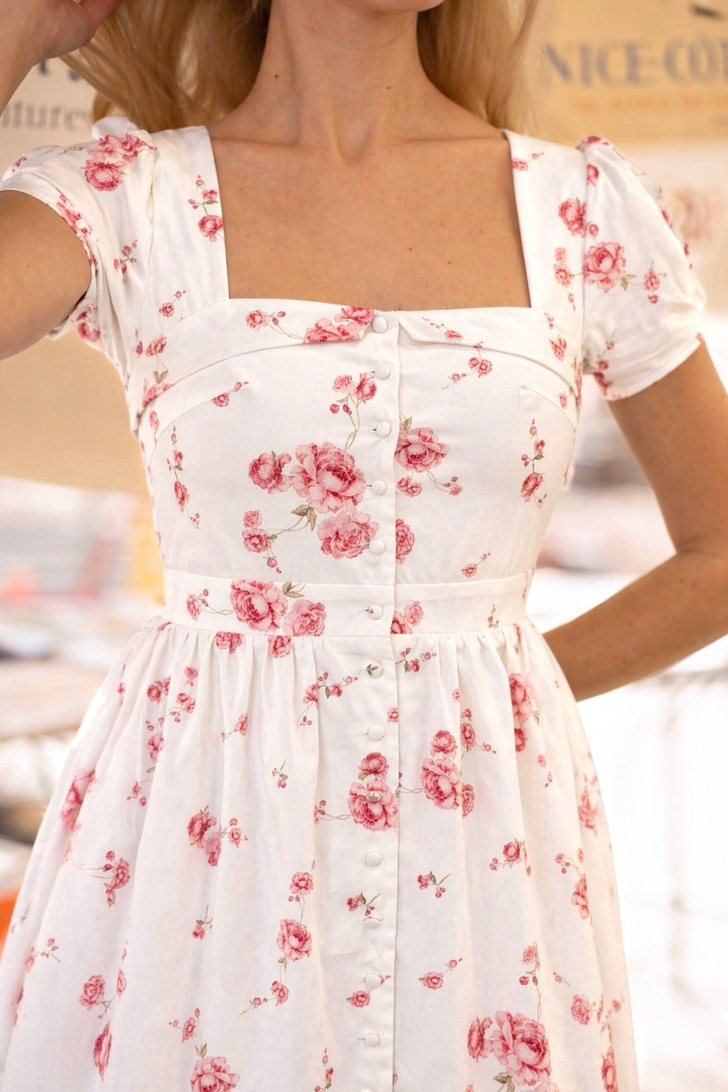 This midi button-down dress is crafted from breathable cotton with a viscose lining and features a peony print created by our in-house artisan. The silhouette includes capped sleeves, feminine bust detail with an adjustable lace-up back, and a cinched waist that flows into a full skirt.