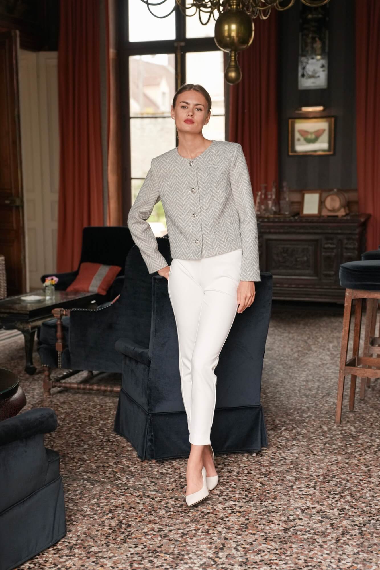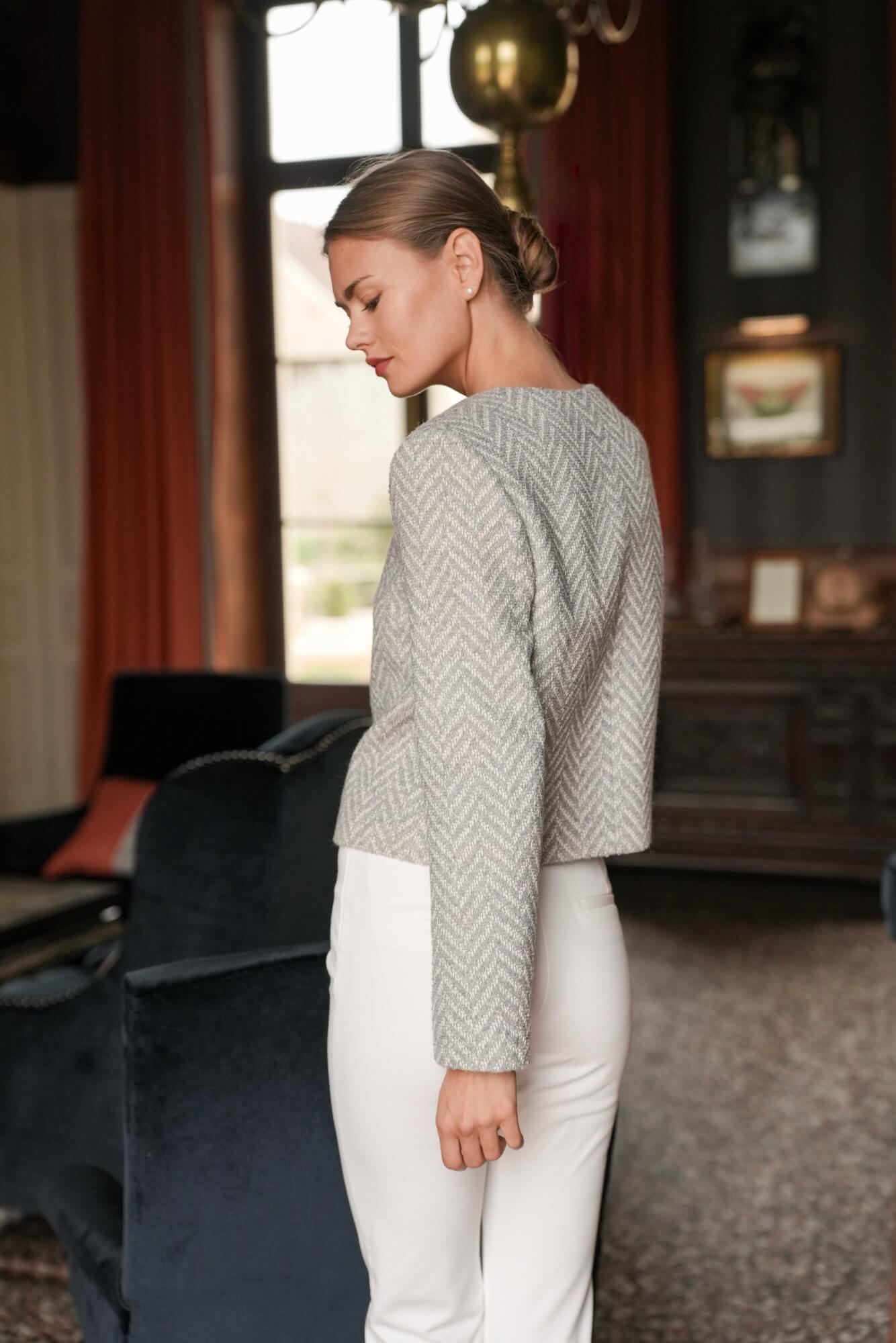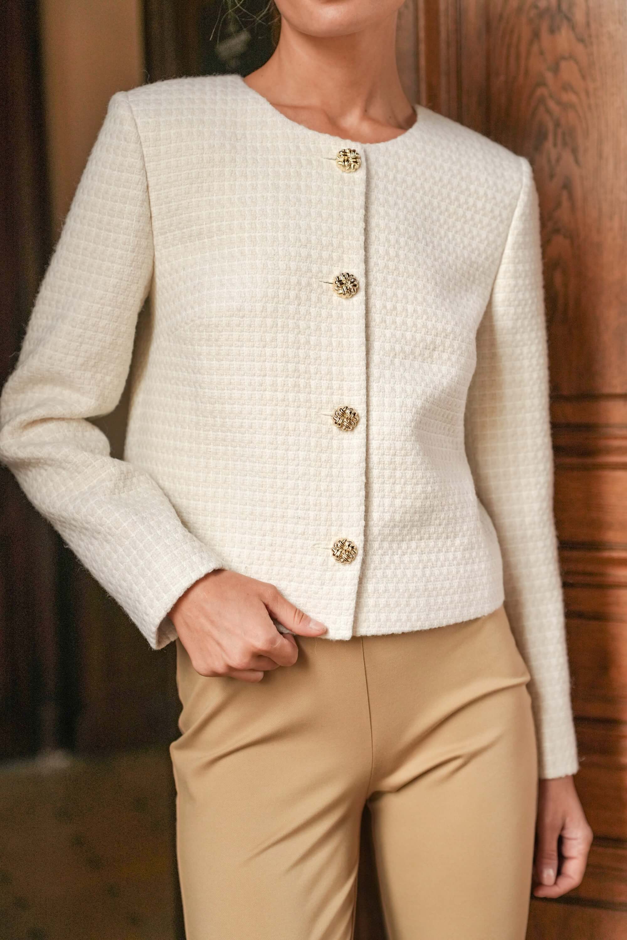 This lightweight short coat jacket is tailored from the finest upcycled wool tweed and fully lined. Designed with a boxy cut, it features long sleeves, a button-down front, and a rounded collar.