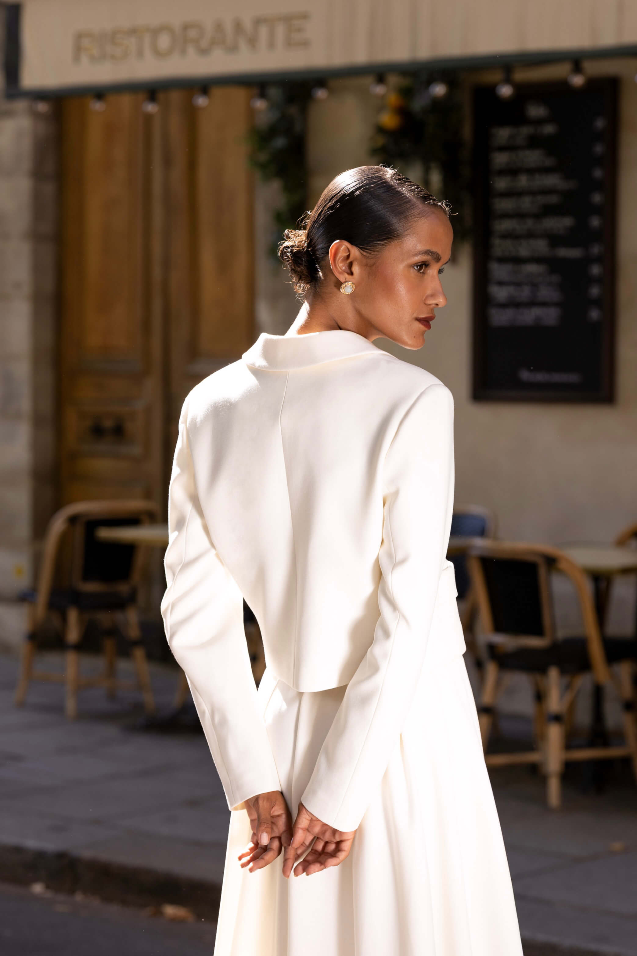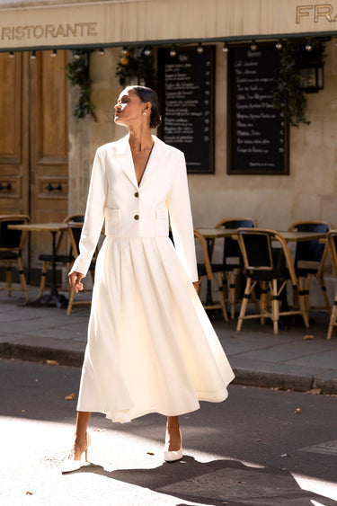 This two-piece set is created from a premium upcycled wool blend. The cropped jacket features a sharp collar, button-down front, and a fitted silhouette that sits at the waist. It pairs with a full-bodied, midi-length skirt, cut in an A-line shape with soft pleats for natural movement.