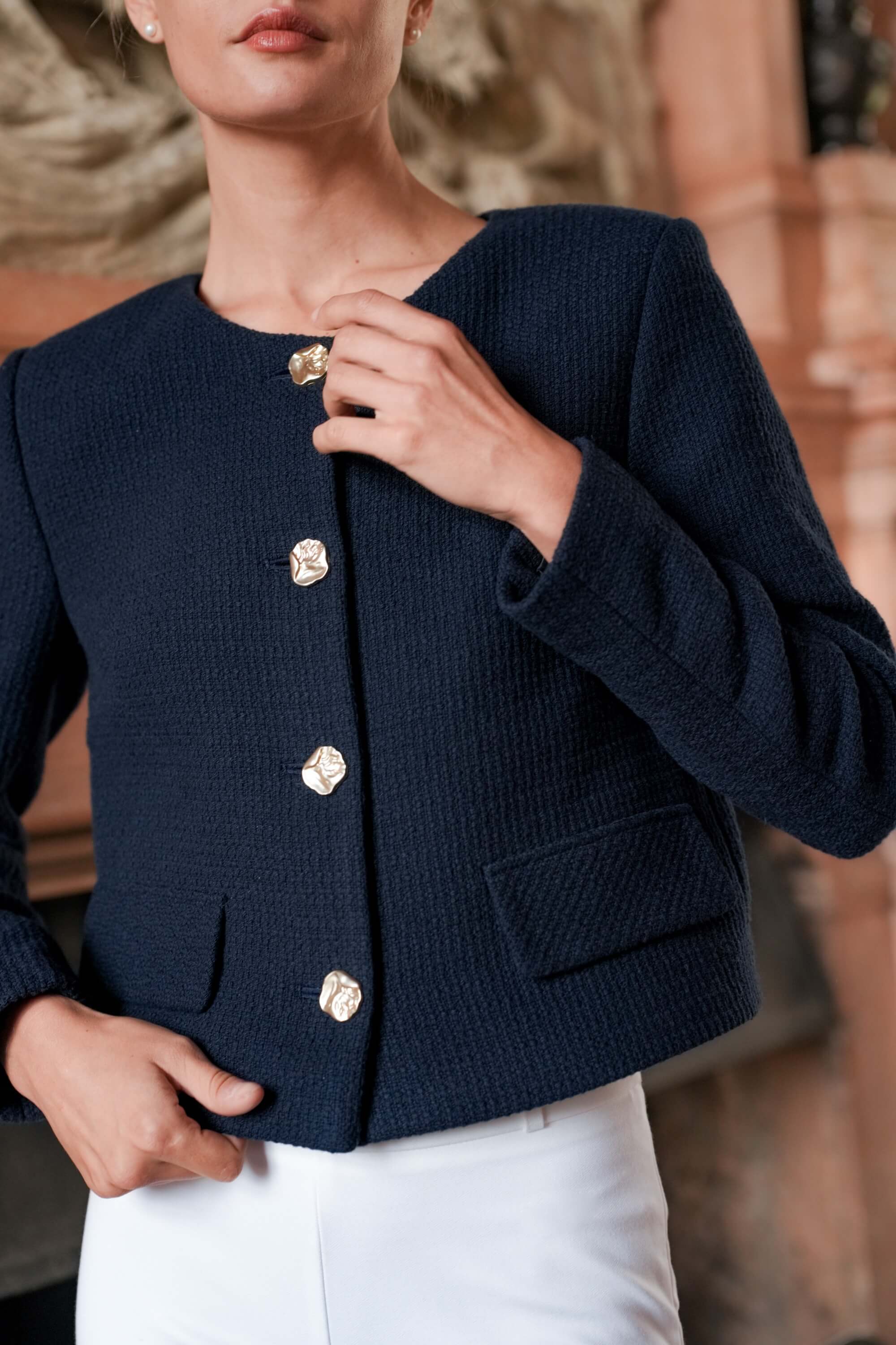 This jacket is created from luxurious Italian cotton tweed. The jacket is designed with a straight silhouette, featuring a high neckline, long sleeves, a button-down front, and decorative faux pockets.