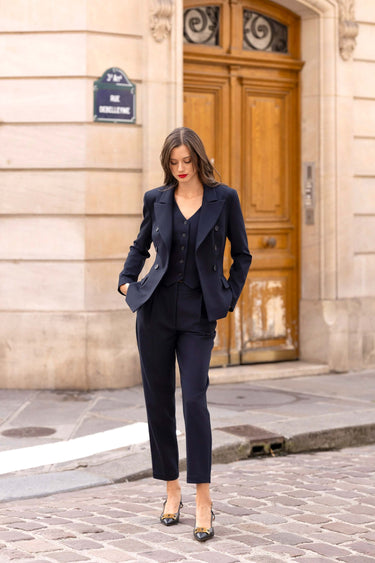 This four-piece set is crafted from durable upcycled wool. The jacket features a V-neck with a classic collar, double-breasted closure, front pockets, a tapered waist, and a hip-length cut. The tailored vest features a button-down front and an adjustable back strap. The slim-fit skirt includes an invisible side zipper and a back slit for mobility. The high-waisted trousers are finished with a front closure, belt loops, side pockets, and a tapered leg.