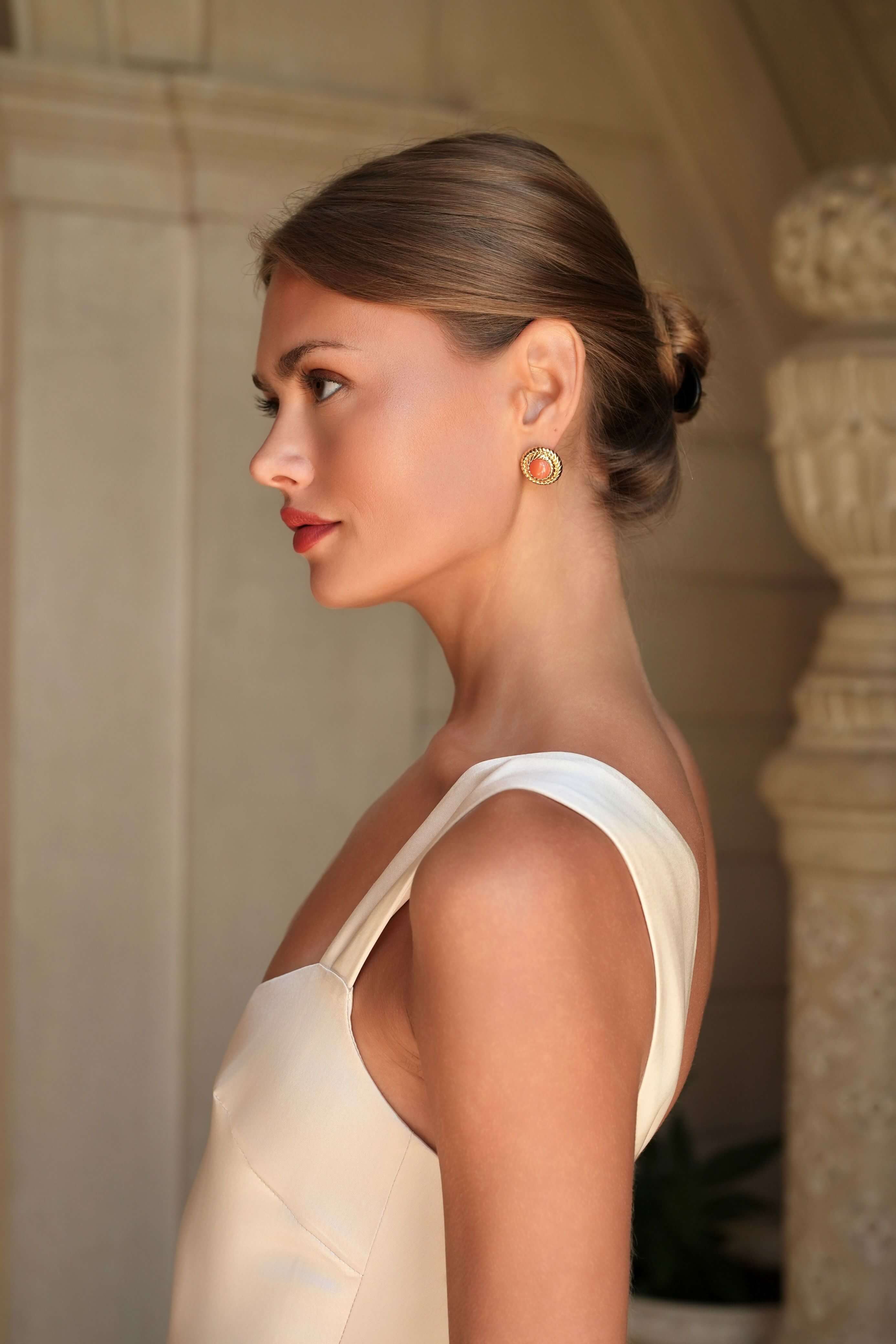 Crafted with heavy 4-micron gold plating, these Sardonyx button stud earrings highlight the unique orange hue of the August birthstone. Renowned for its vibrant color and symbolic ties to strength and protection, Sardonyx is believed to promote confidence and stability, making it an empowering choice for those born in August. The gemstone is elegantly encircled by a textured triple rope design, adding a refined touch to the bold silhouette.