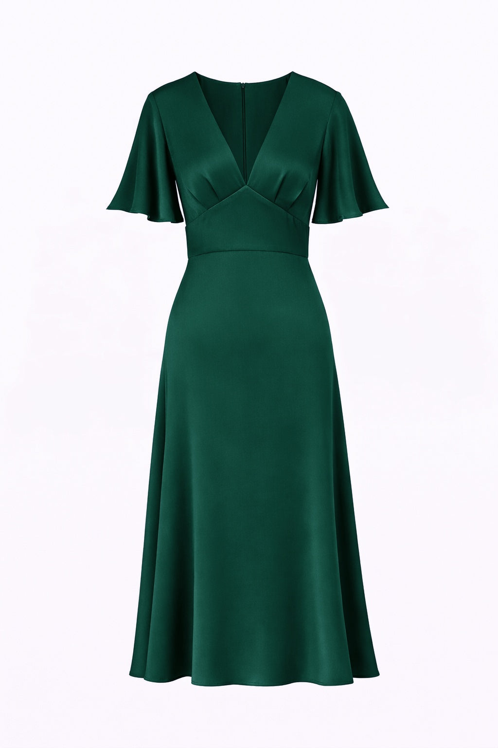 Crafted from upcycled Double Crepe Heavyweight silk with a luxurious stretch, this dress features delicate flutter sleeves that artfully frame a plunging v-neckline while a tailored waist gives way to a full skirt. The design is available in both elegant open-back and closed-back styles.