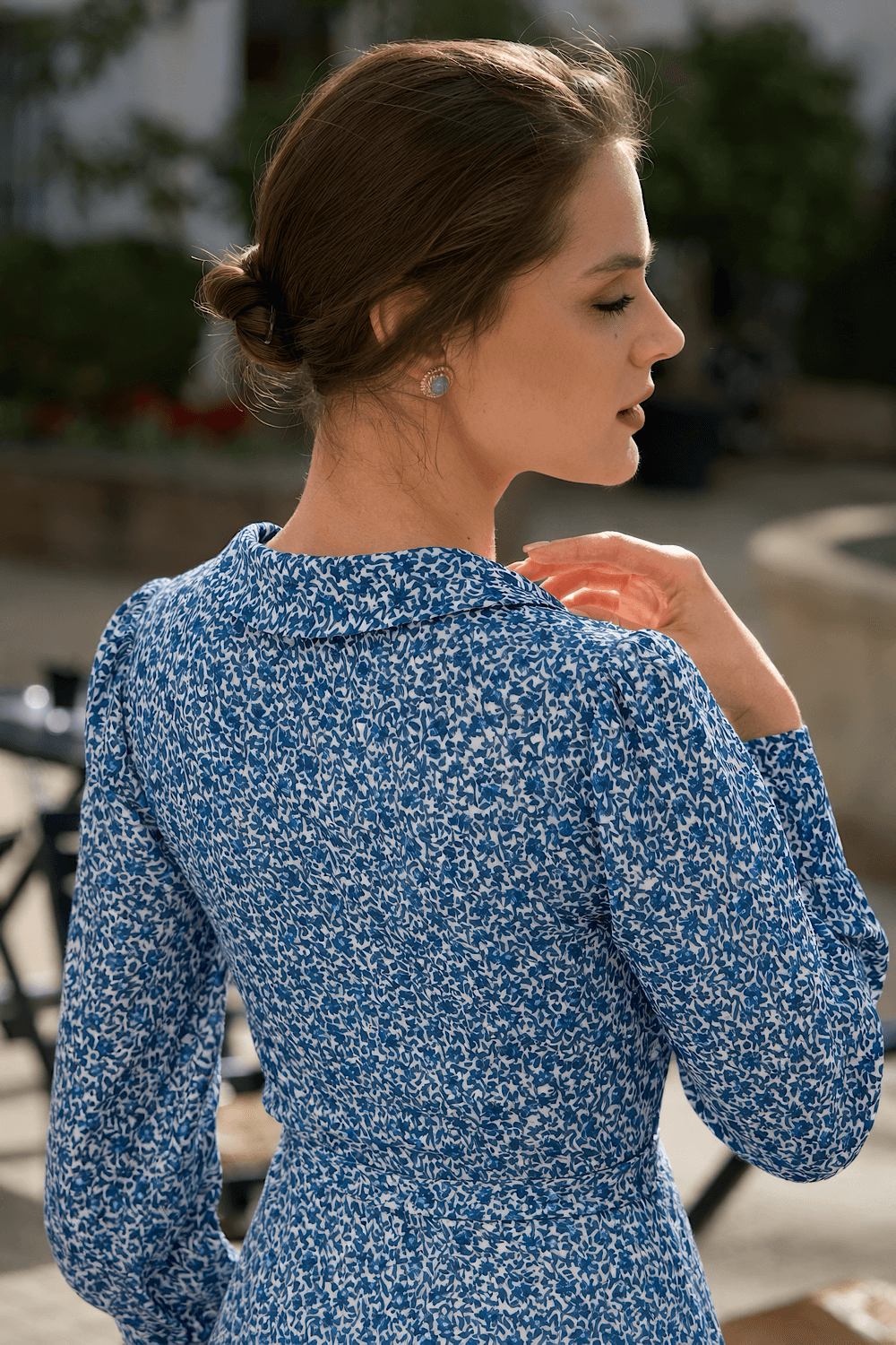 Crafted from lightweight upcycled chiffon silk, this playful mini dress boasts a plunging v-neckline framed by bishop sleeves with button cuff enclosures. The design highlights a cinched waist, emphasizing the silhouette, and finishes with a lively tiered ruffle skirt.