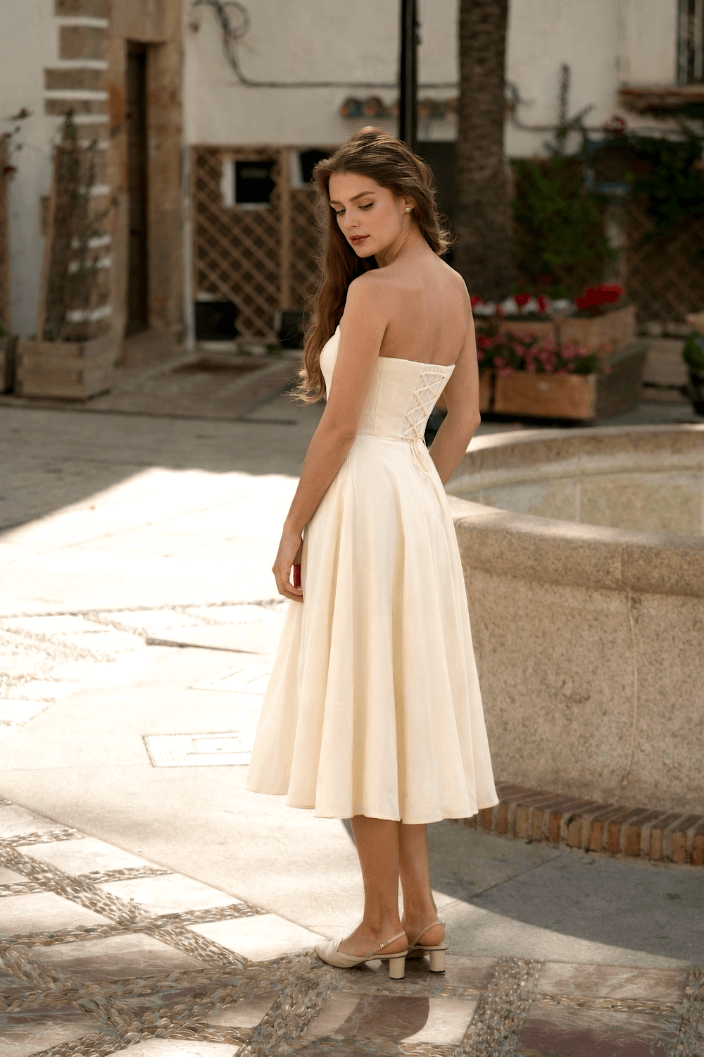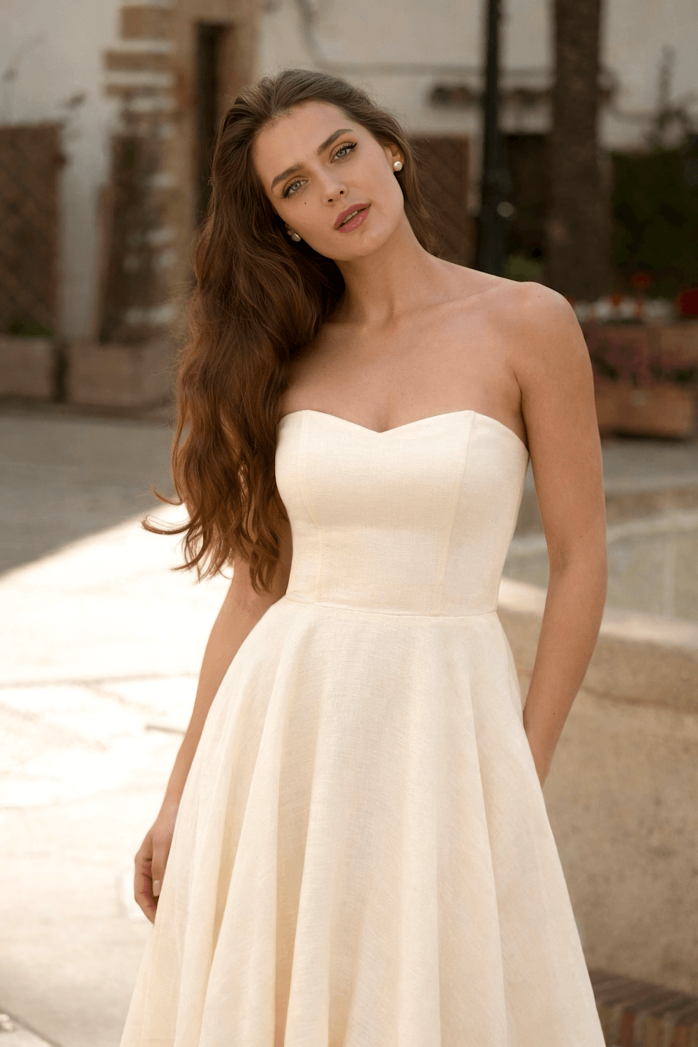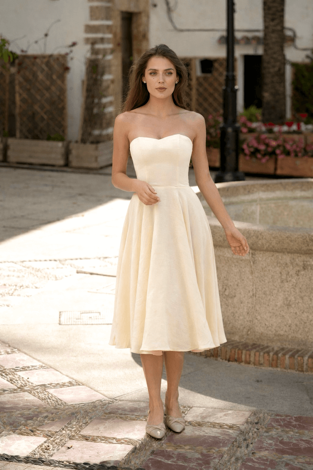 This strapless dress is created from sustainable linen with a viscose lining, featuring a corset-style bodice, an elasticated back, and adjustable lacing for a customizable fit.