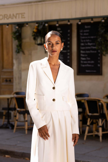 This two-piece set is created from a premium upcycled wool blend. The cropped jacket features a sharp collar, button-down front, and a fitted silhouette that sits at the waist. It pairs with a full-bodied, midi-length skirt, cut in an A-line shape with soft pleats for natural movement.