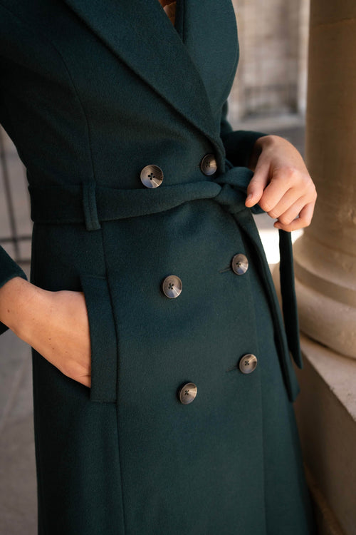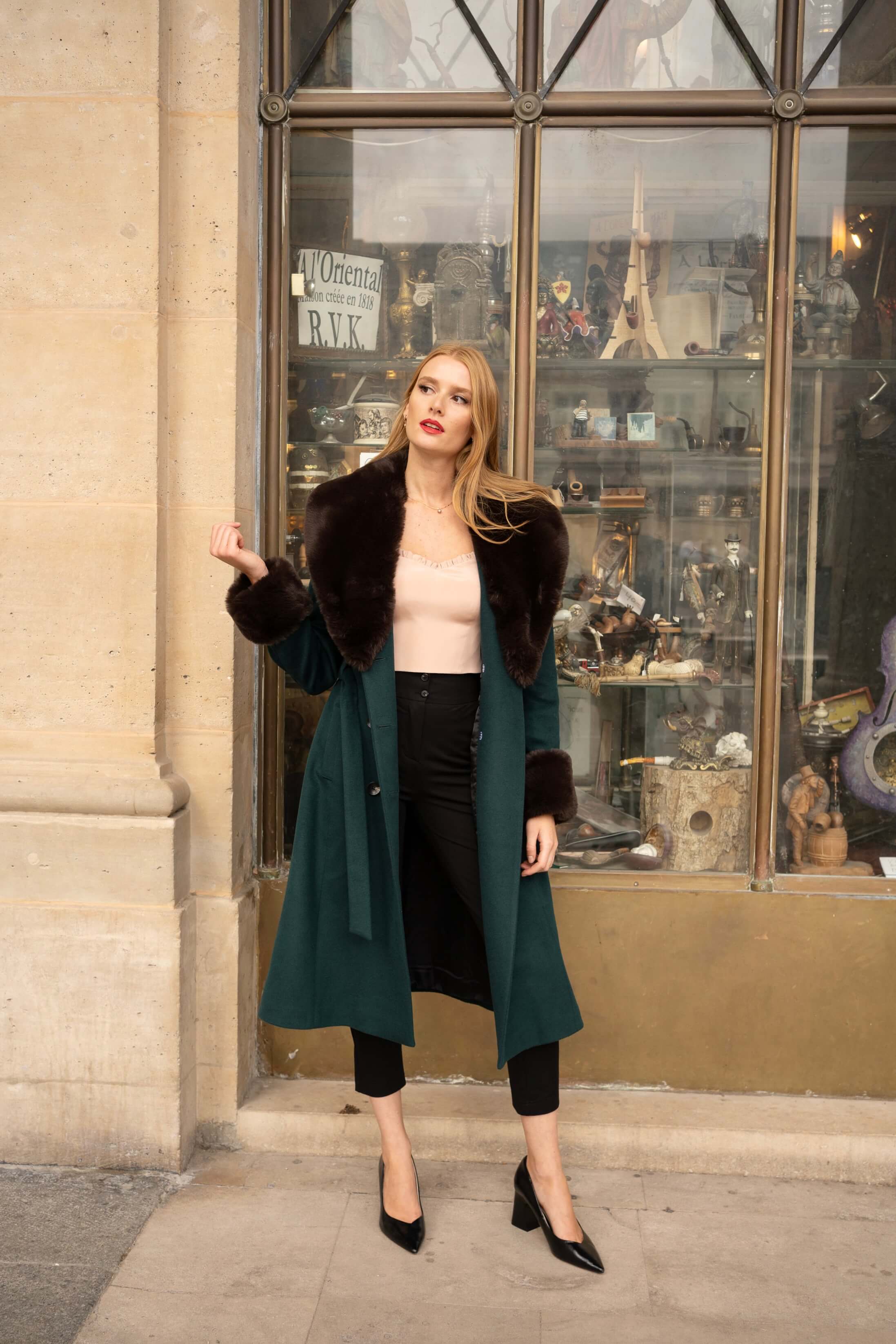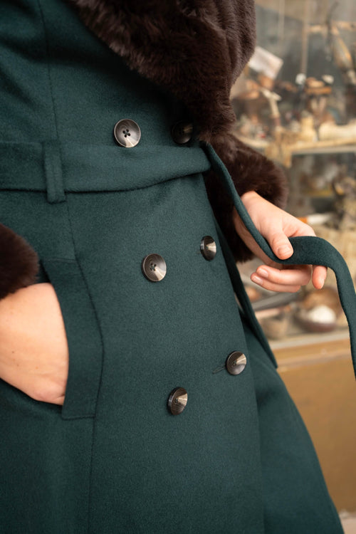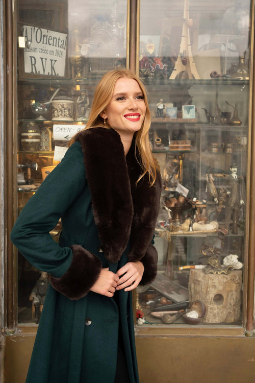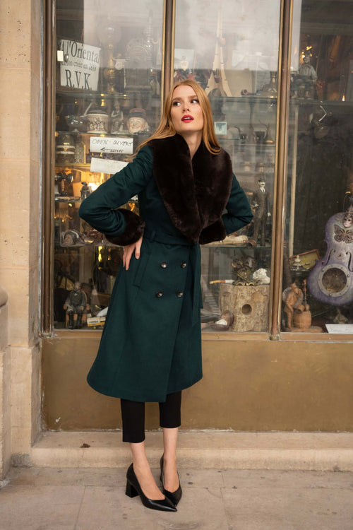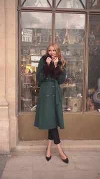 Crafted from an exquisite upcycled wool, this double-breasted coat features a removable faux-fur trim at the collar, adding a layer of opulence while convenient pockets add functionality. With the fur, this coat exudes sophistication, while without it, transforms into a versatile piece perfect for any occasion.