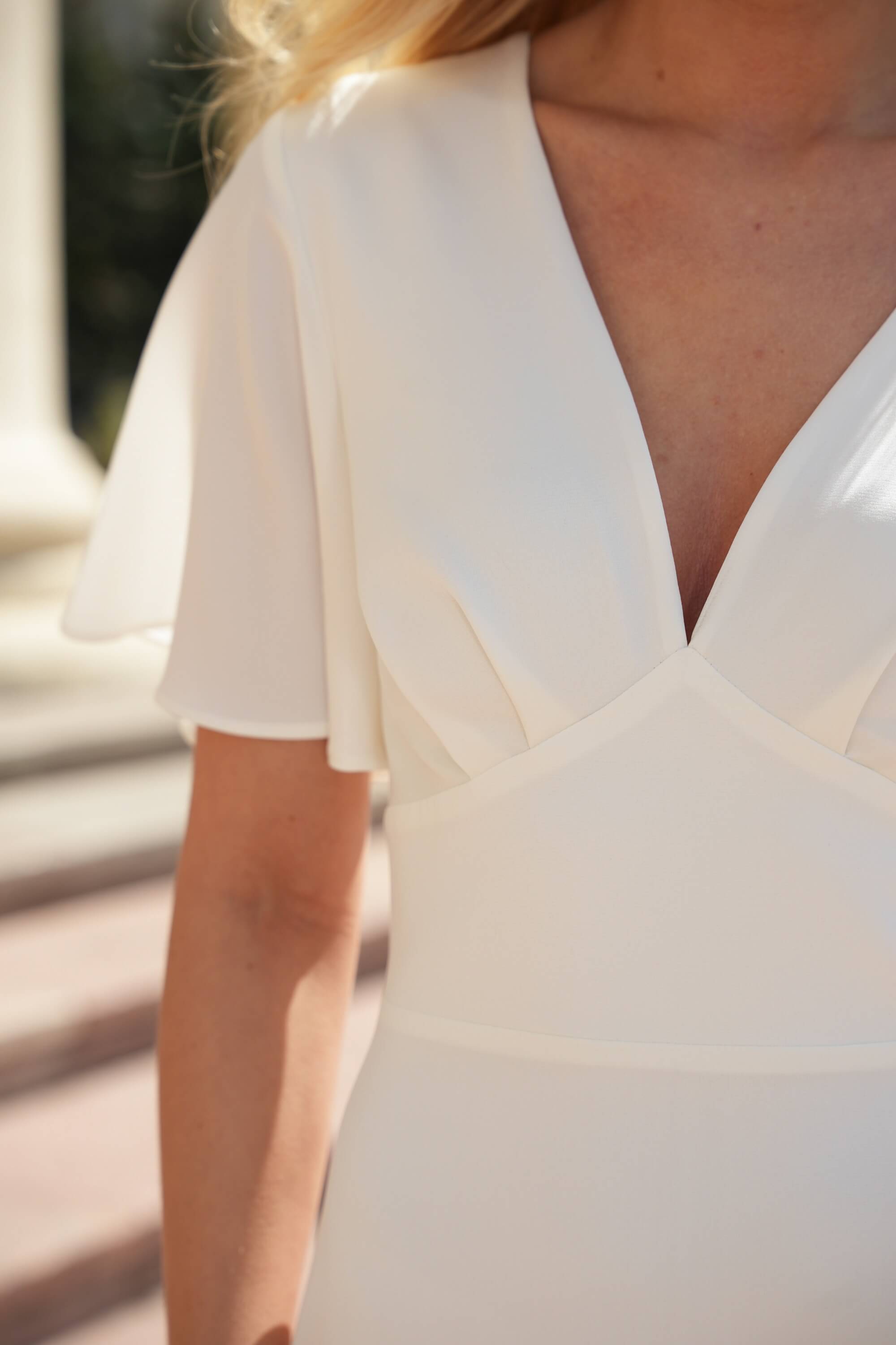 Silk wedding dress with a v-neckline, flutter sleeves