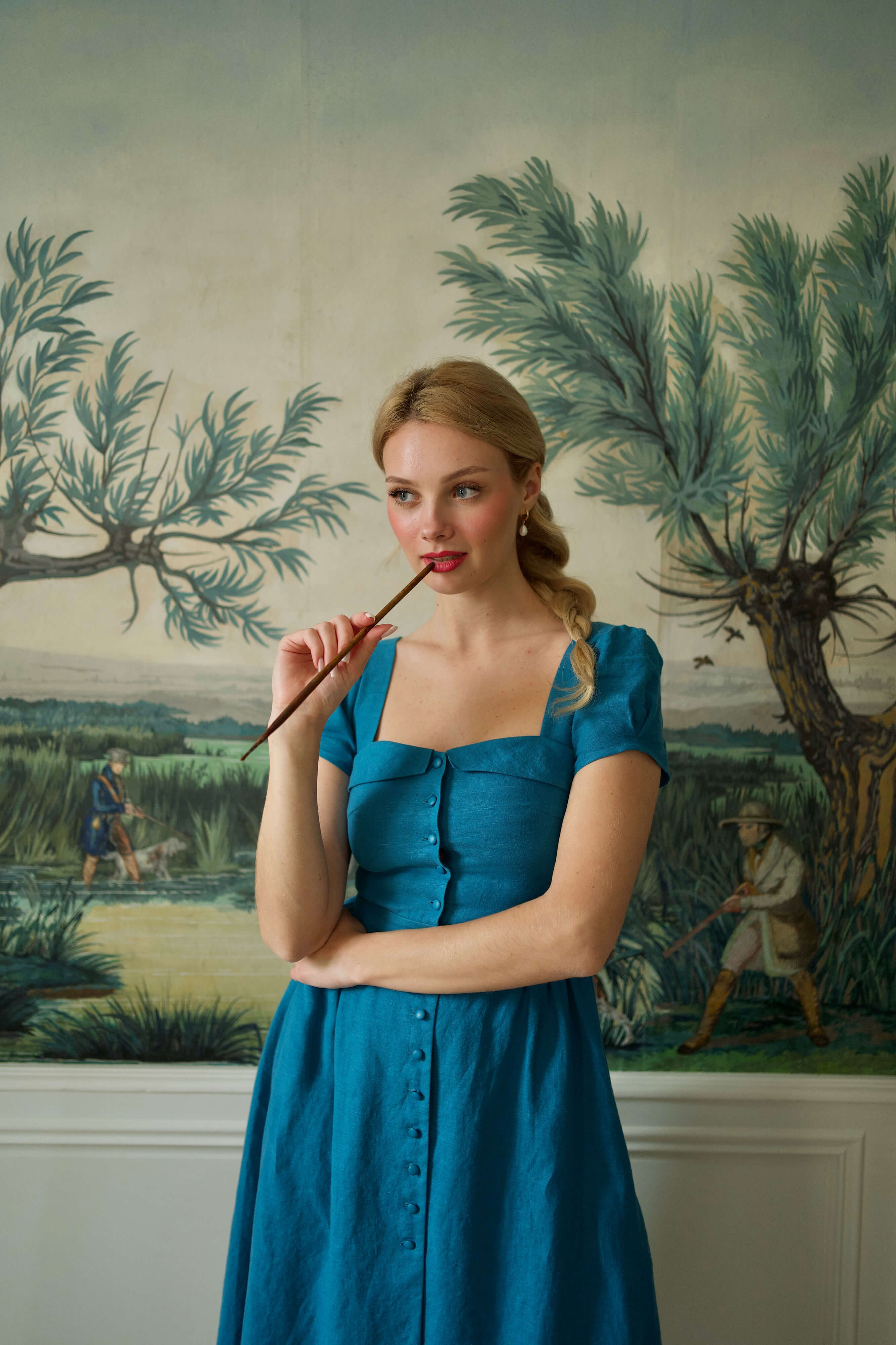 This midi button down dress is created from sustainable linen. The silhouette includes capped sleeves, feminine bust detail with an adjustable lace-up back, and a cinched waist that flows into a full skirt.