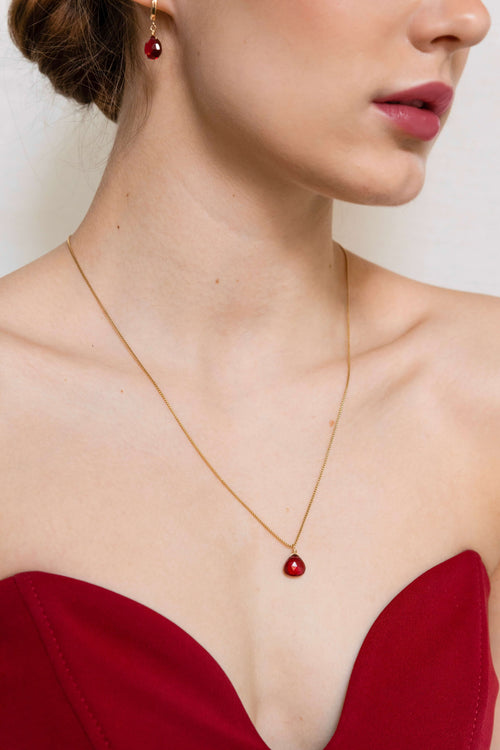 It all started with a kiss. This necklace is handcrafted with a Mozambique garnet stone suspended from an adjustable 14k gold-filled chain. For a romantic ensemble, pair with “Le Bisou” earrings.