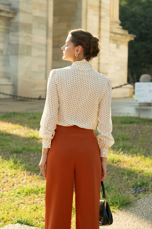 Crafted from a mélange of upcycled fabrics, these long pants are flattering and comfortable, boasting a high-waisted silhouette with fitted waist. The pleats, two rows of buttons, and relaxed fit combine seamlessly to create a sophisticated, laid-back feel that can equally be dressed up or down.