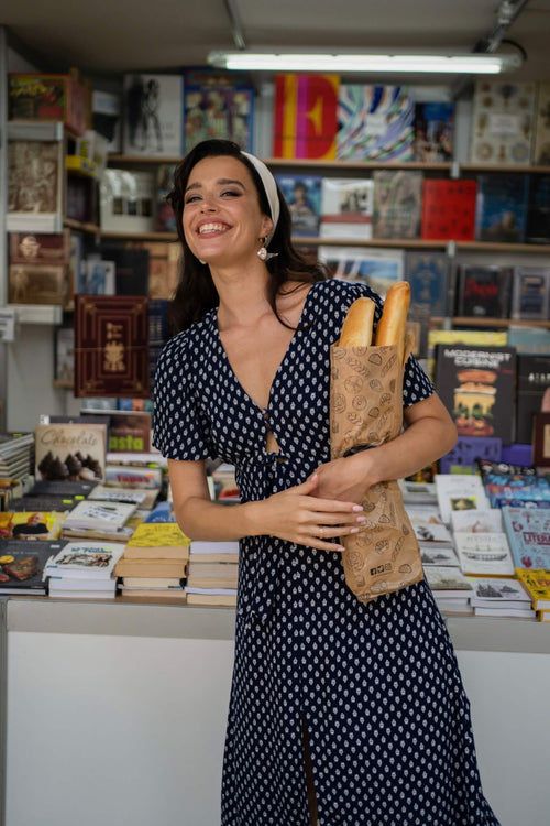 This dress is crafted from luxurious viscose. Style with our upcycled silk Ivy headband and Giulia raffia bag.