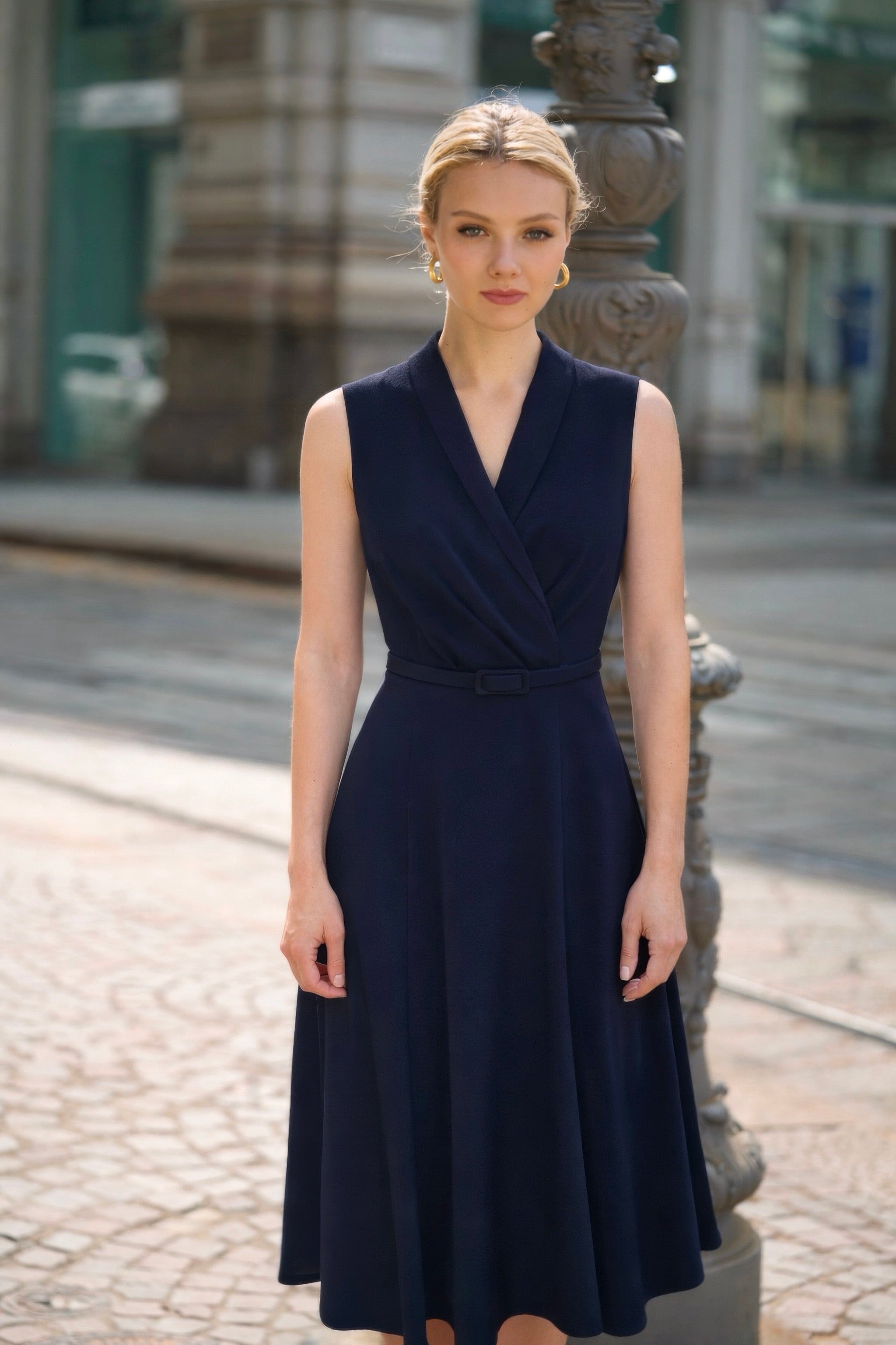 Crafted from a refined upcycled blend, this midi dress features a sleeveless silhouette with a V-neck and faux wrap bodice, accented by a shawl collar. The bodice showcases subtle folds that lead into a flared skirt. A removable ready-made belt with a buckle defines the waist. Fully lined, the dress closes with a discreet side zipper.