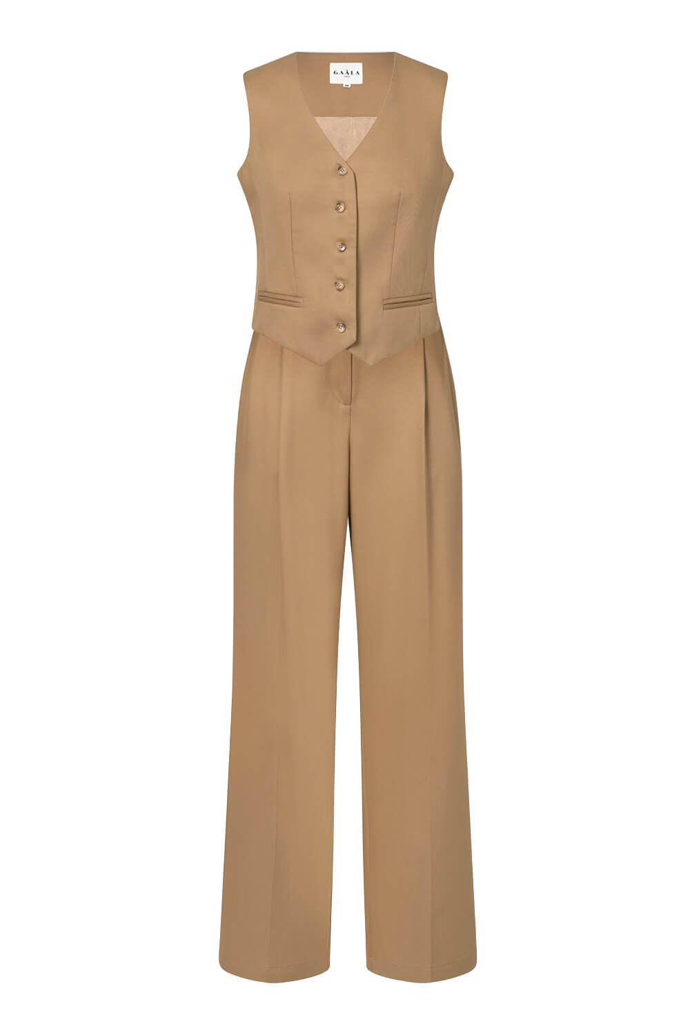 Crafted from a luxurious blend of upcycled lyocell with a viscose lining, this two-piece set features a vest with a relaxed fit, button down front, and faux double welt pockets. The pants are detailed with two folds on each side, trouser pockets, a front zipper with a hidden hook clasp, and belt loops.