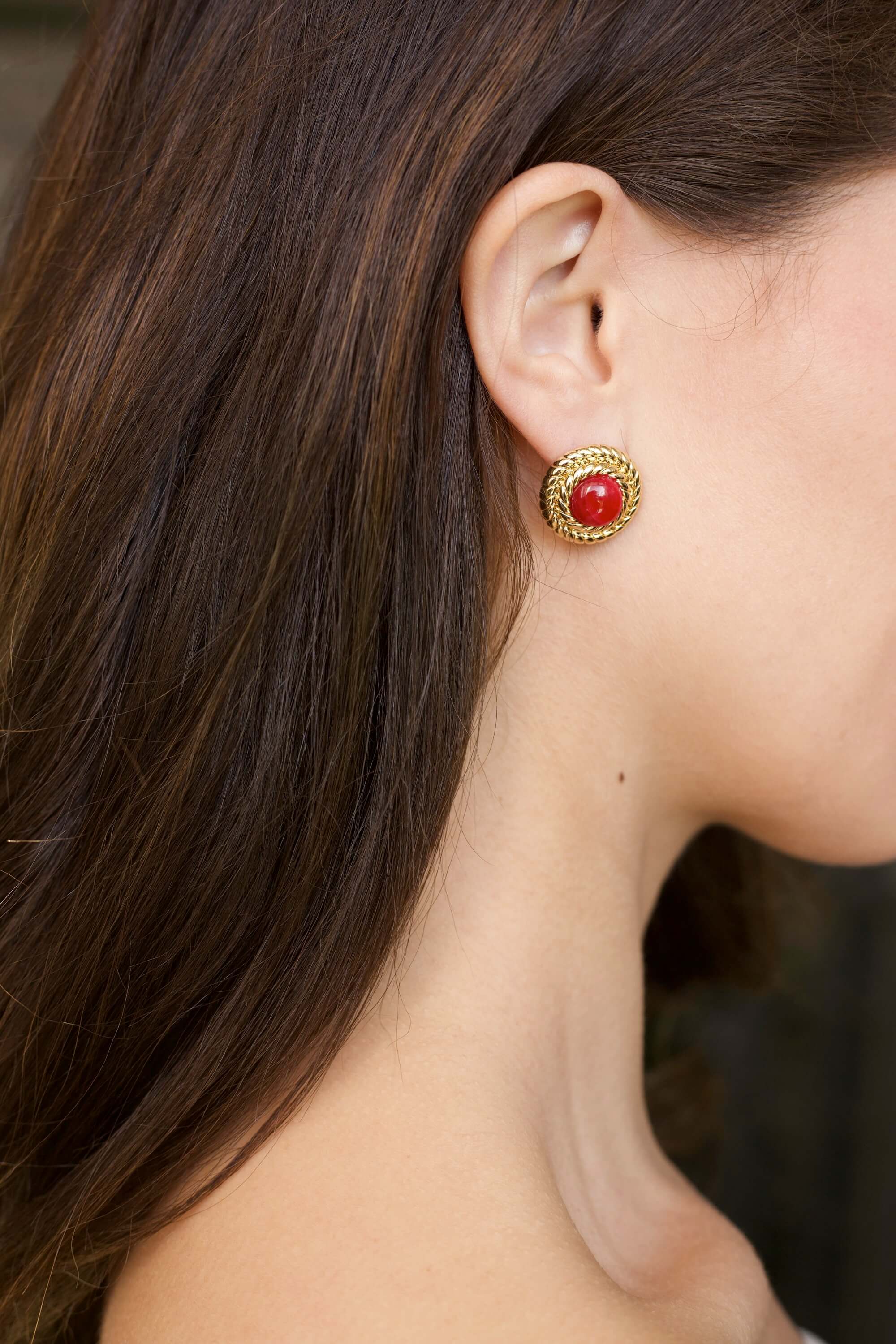 Ces boucles d'oreilles en rubis rose, en plaqué or 4 microns, mettent en valeur l'audacieuse pierre de naissance du mois de juillet. Vénéré pour sa teinte vibrante et son association symbolique avec la passion et la vitalité, le rubis est censé renforcer le courage et l'enthousiasme, ce qui en fait un choix empreint de signification pour les personnes nées en juillet. La pierre précieuse est élégamment entourée d'une triple corde texturée, ajoutant une note de raffinement à cette pièce audacieuse.