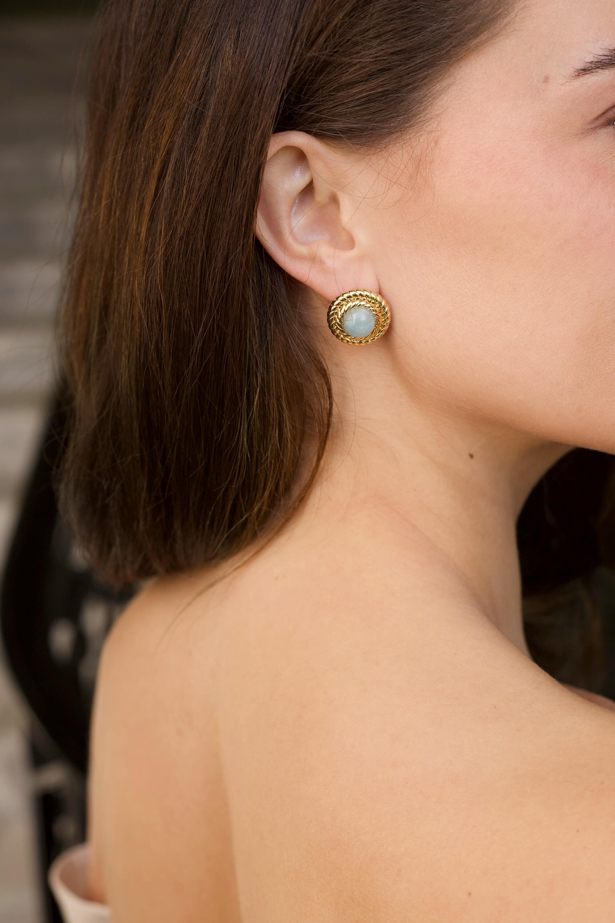 Ces boucles d'oreilles en aigue-marine, en plaqué or 4 microns, présentent la pierre de naissance du mois de mars dans une sublime teinte bleu-vert. L'aigue-marine est réputée pour ses propriétés apaisantes et sereines, apportant tranquillité d'esprit et clarté à la personne qui la porte, ce qui en fait un choix empreint de signification pour les personnes nées en mars. La pierre précieuse est élégamment entourée d'une triple corde texturée, ajoutant une note de raffinement à cette pièce audacieuse.