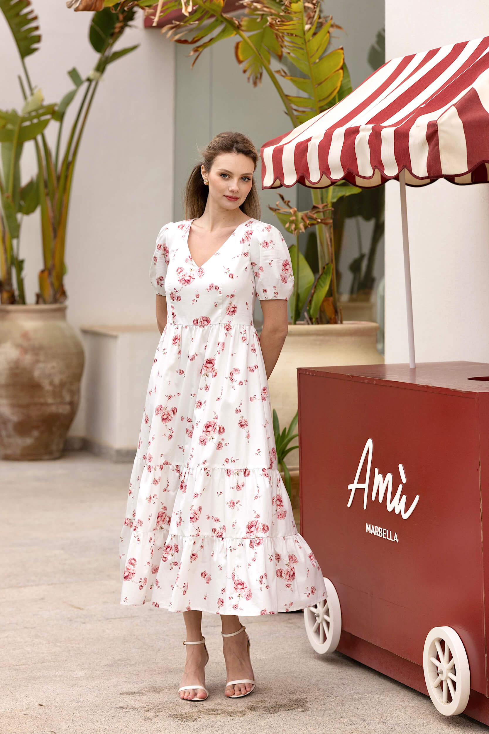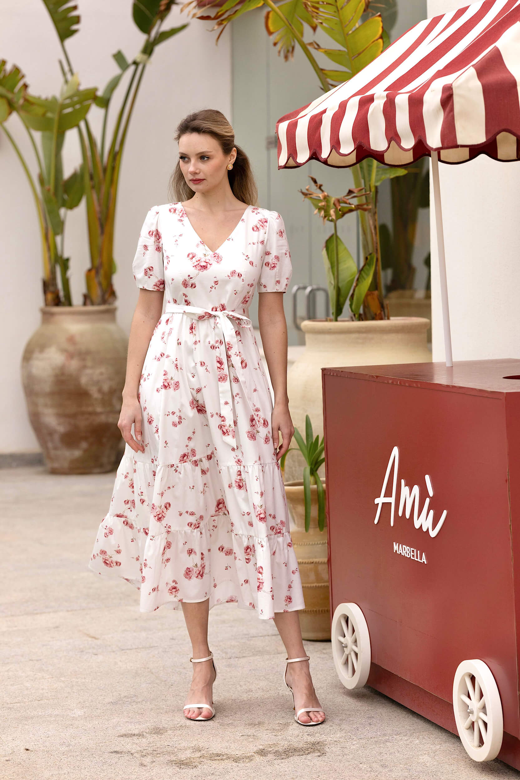 Cette robe midi, confectionnée en coton respirant et doublée de viscose, offre une coupe décontractée et fluide, rehaussée par une ceinture amovible pour structurer la silhouette. Son encolure en V met délicatement le décolleté en valeur, tandis que ses manches courtes sont terminées par une couture discrète. De légères fronces affinent la taille, et sa jupe volantée garantit un mouvement aérien et une belle fluidité.