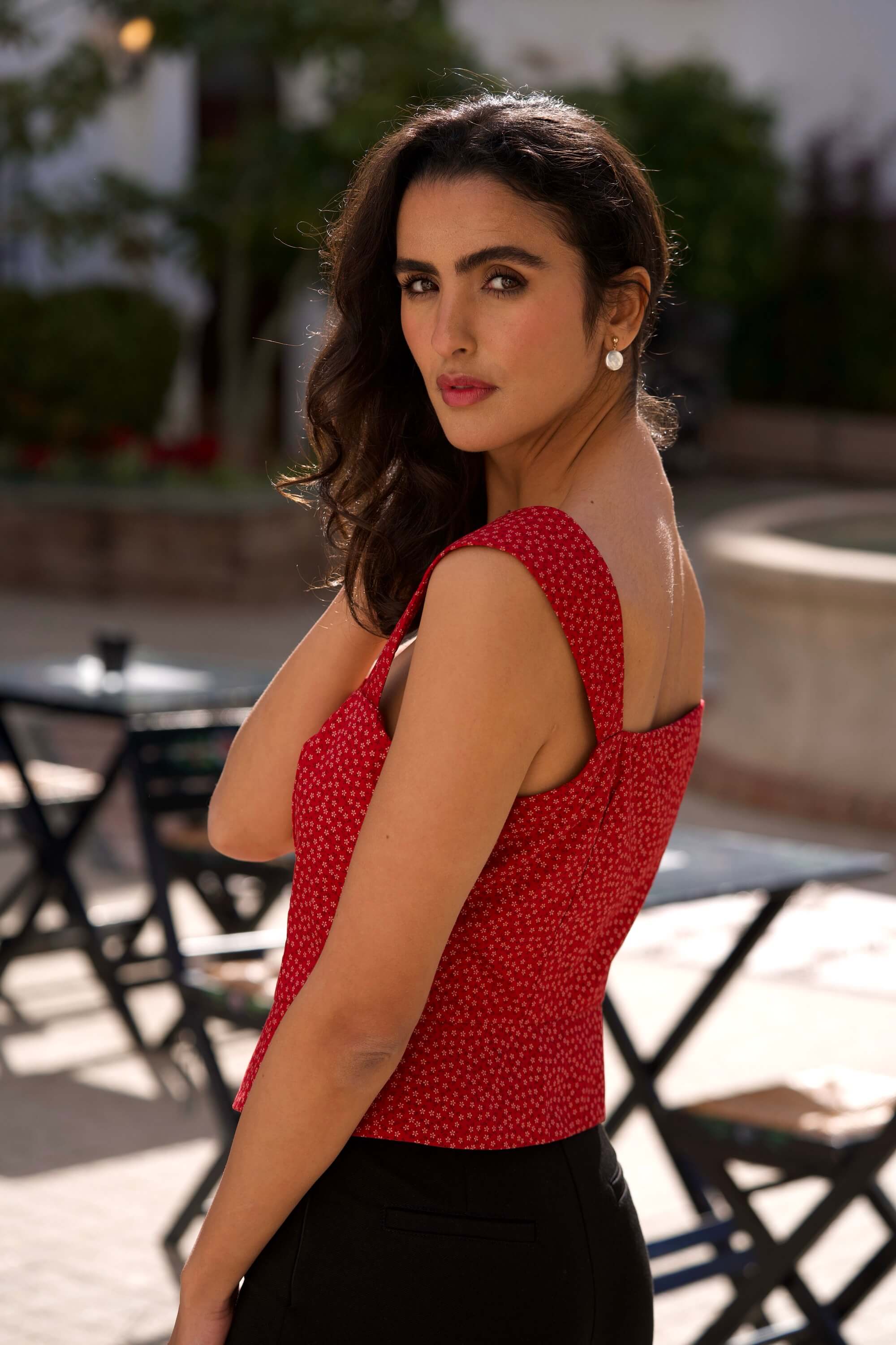 Confectionné dans un coton respirant, recyclé et doublé de viscose, ce haut se distingue par son encolure flatteuse en cœur et sa coupe légèrement évasée, rehaussée d'une fente subtile pour une touche de sophistication.
