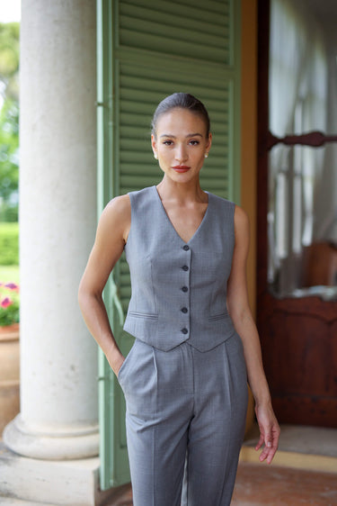 Ce costume trois pièces classique comprend un gilet, une veste longue à double boutonnage et un pantalon à jambe droite assortis, fabriqués avec un savoir-faire exceptionnel à partir de la laine recyclé le plus fin. Lorsqu’ils sont portés ensemble, le gilet et la veste ajoutent une touche supplémentaire de sophistication et de style, mais ils peuvent tout aussi bien être portés séparément. Un pantalon à jambe droite complète le look, avec un design simple et classique, aussi intemporel que polyvalent.