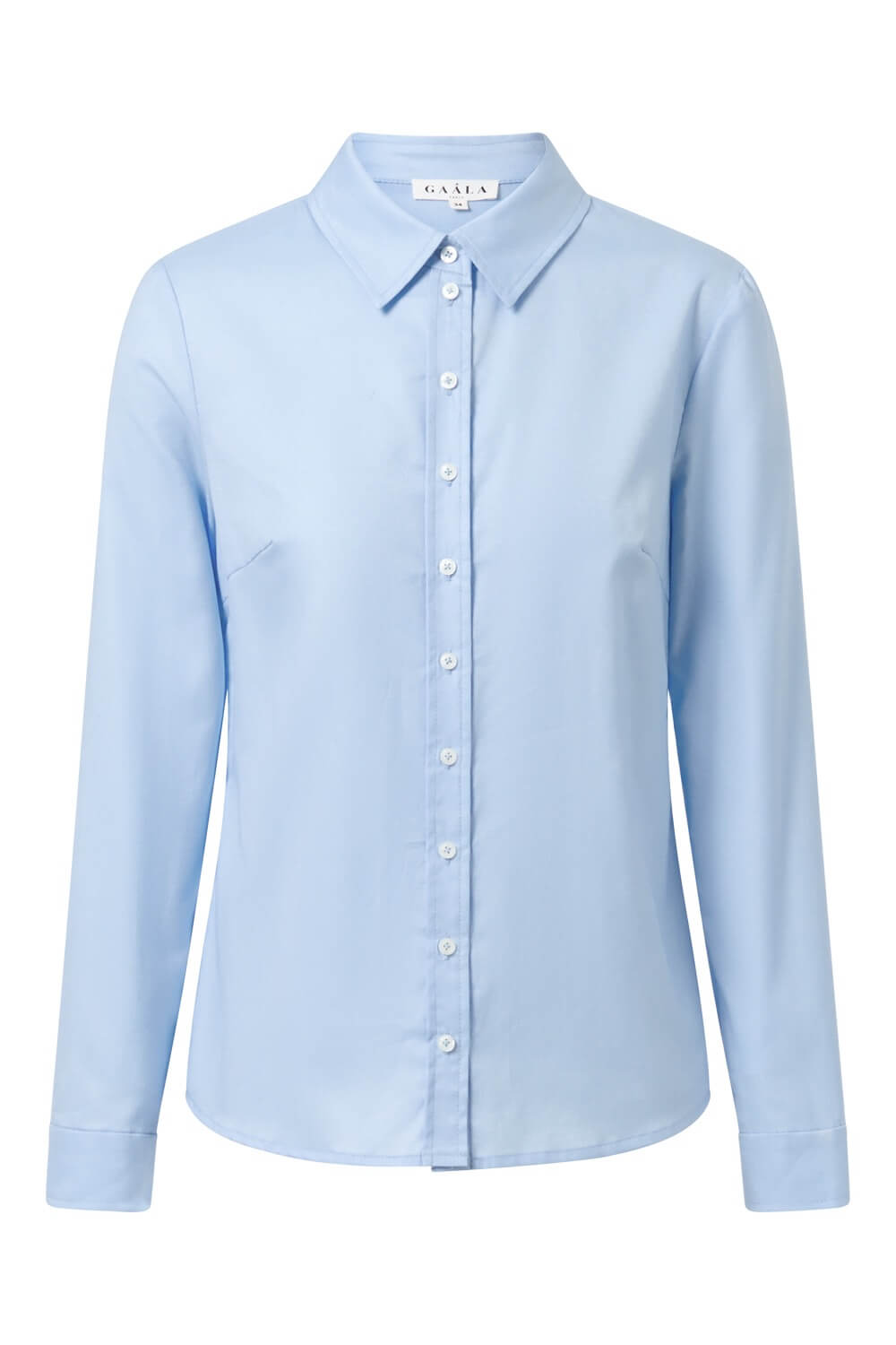 Crafted from breathable upcycled cotton, this long-sleeved button-down blouse is designed with a classic collar and boasts a perfect length for effortless tucking.