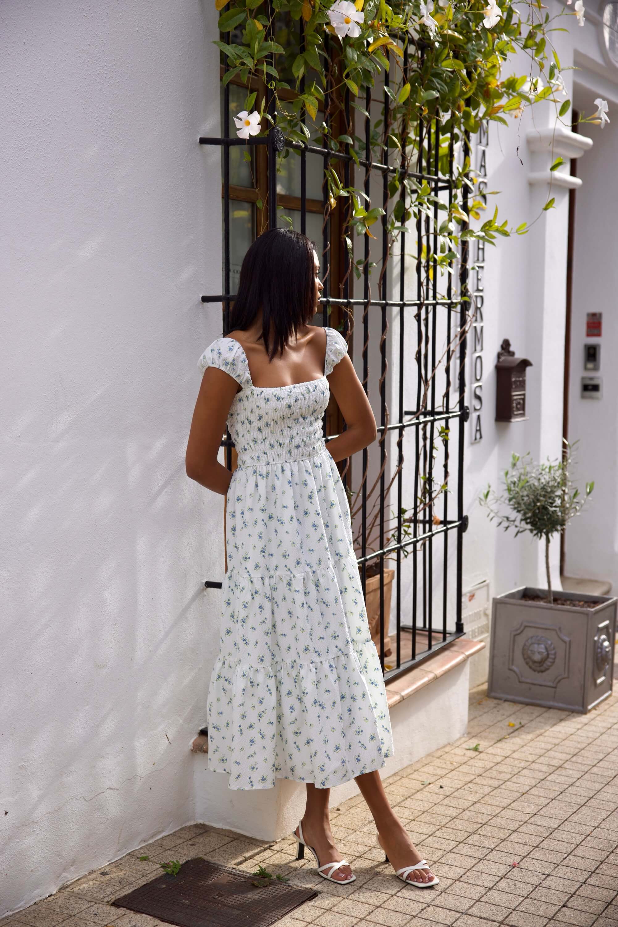 Crafted from breathable upcycled cotton, this dress features a smocked elastic square bodice with elastic-capped sleeves designed for a snug and flexible fit and an elastic waist that opens to a full, tiered skirt.